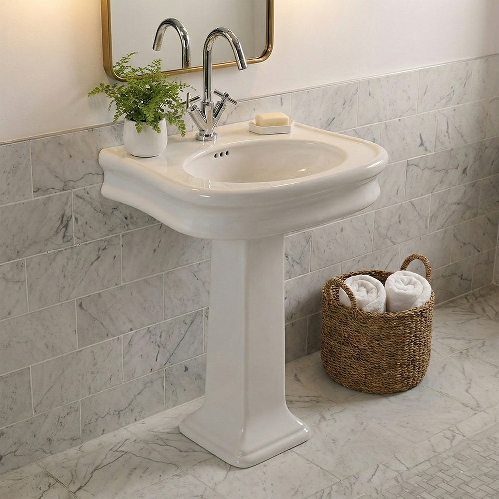 Wall-mount, vanity top, or pedestal porcelain sink with an overflow. Shipping class 3.