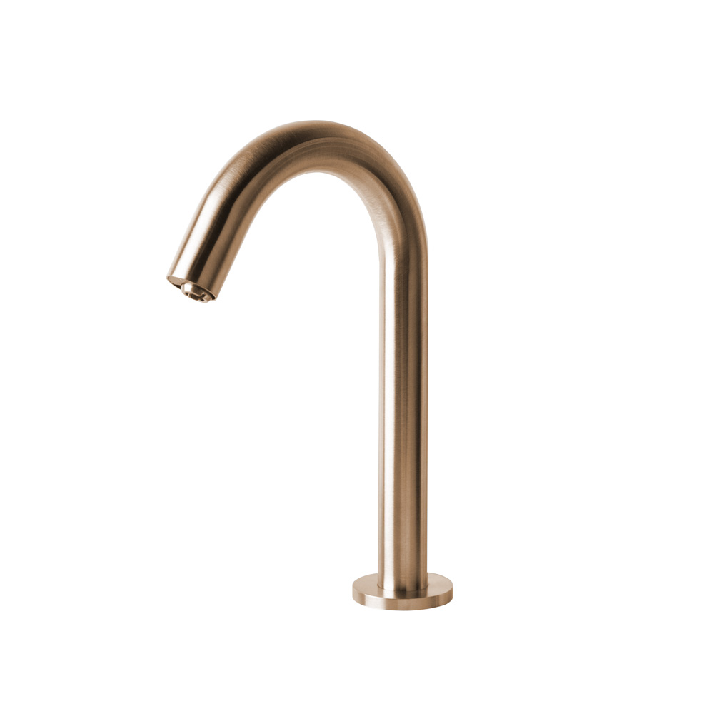 Electronic deck-mounted touch-free soap dispenser with goose-neck spout and bottle kit. AC-DC Input Voltage: 120V, includes transformer and battery pack. Small soap bottle supplied upon request - specify code EXBTS at the time of order. Shipping class 1.