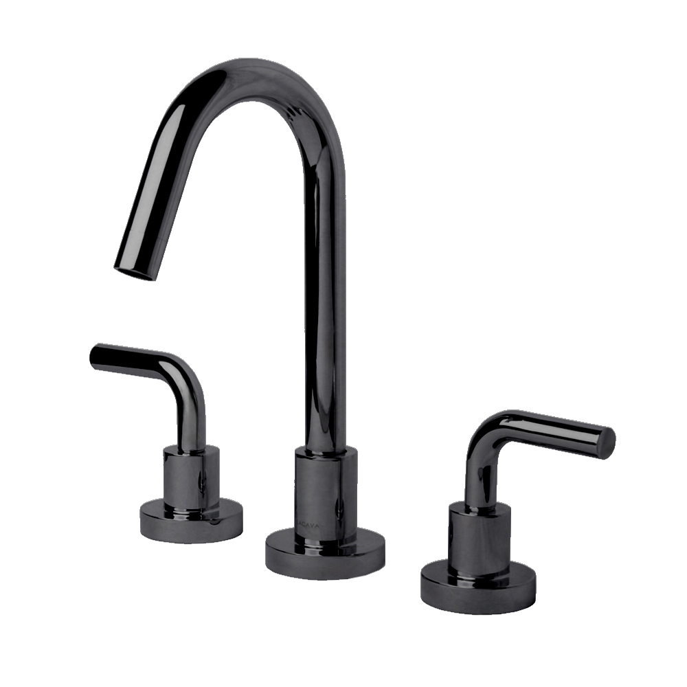 Deck-mount three-hole faucet with a goose-neck swiveling spout, two lever handles, and pop-up drain 7100-17 included. Water flow rate: 1.2 gpm pressure compensating aerator. Shipping class 1.