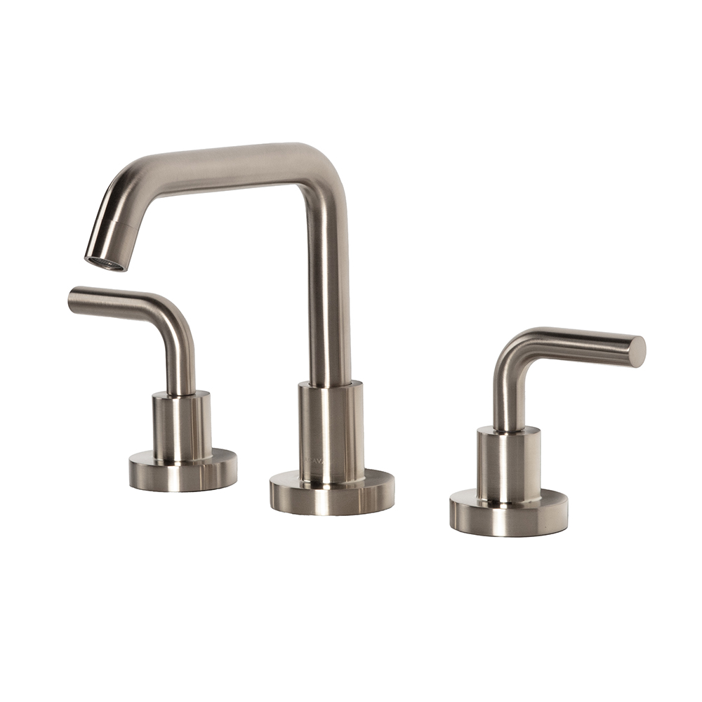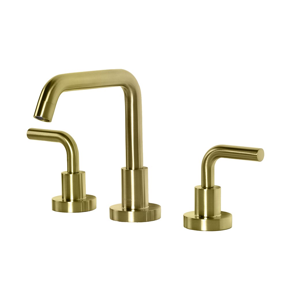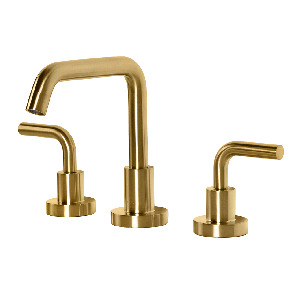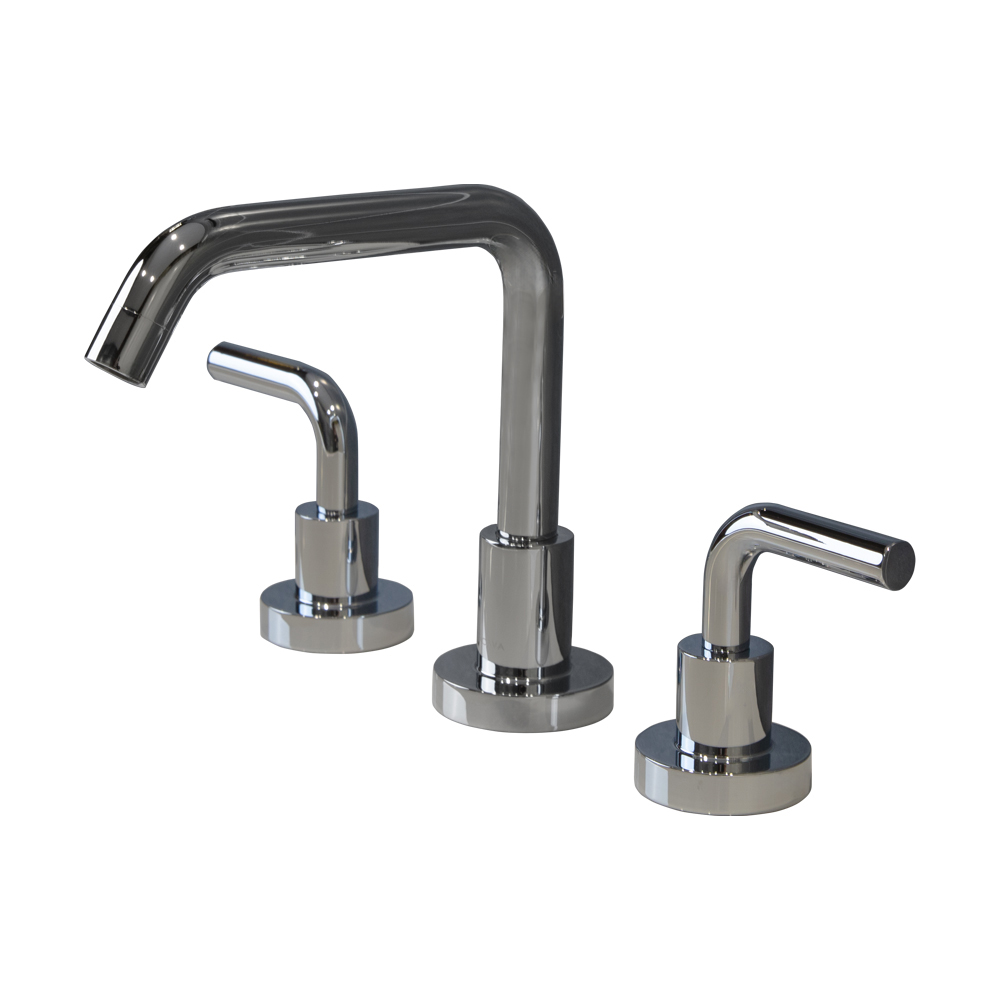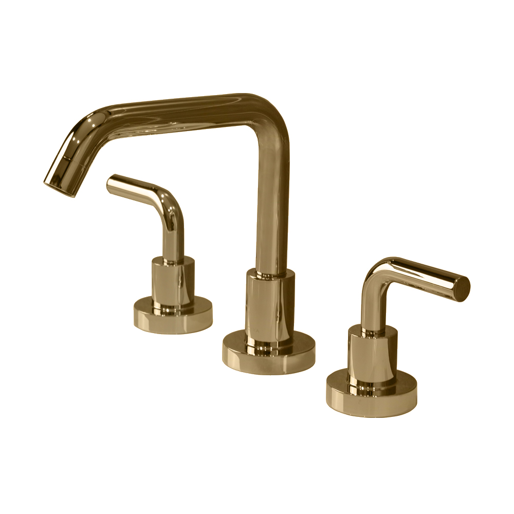 Deck-mount three-hole faucet with a goose-neck swiveling spout, two lever handles, and pop-up drain 7100-17 included. Water flow rate: 1.2 gpm pressure compensating aerator. Shipping class 1.
