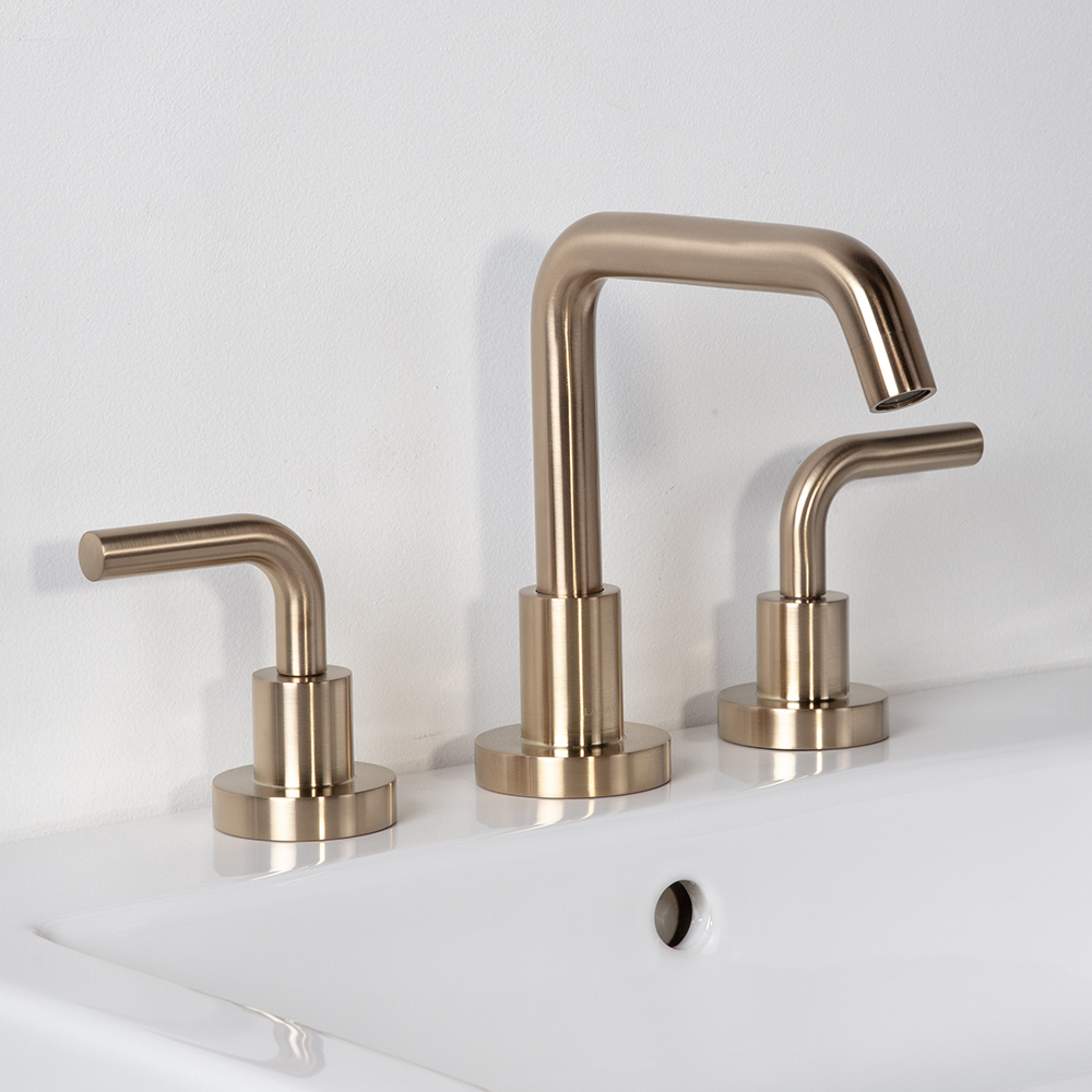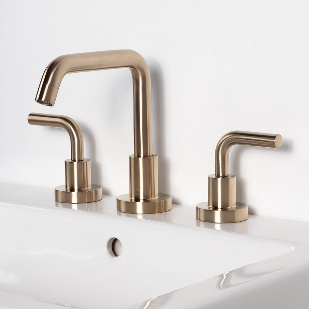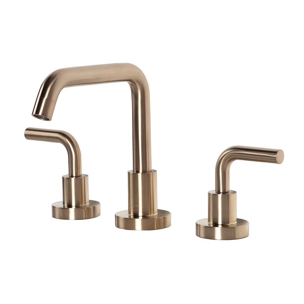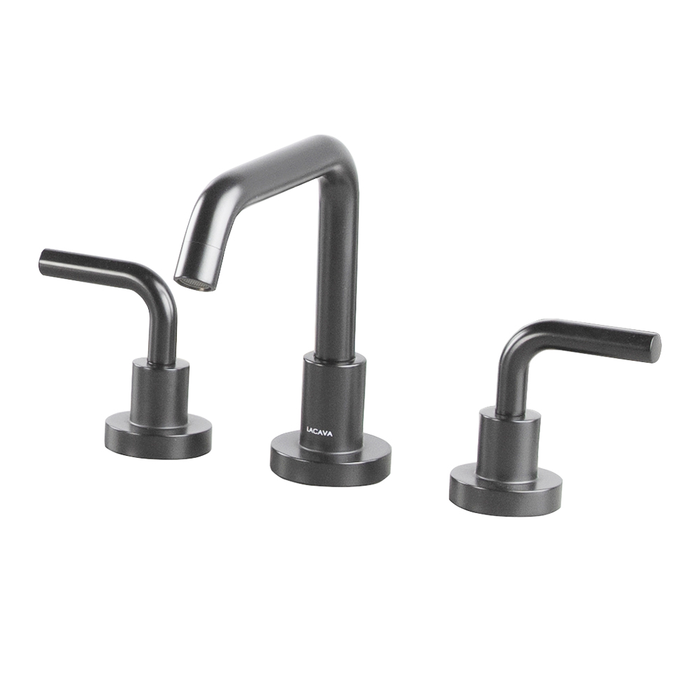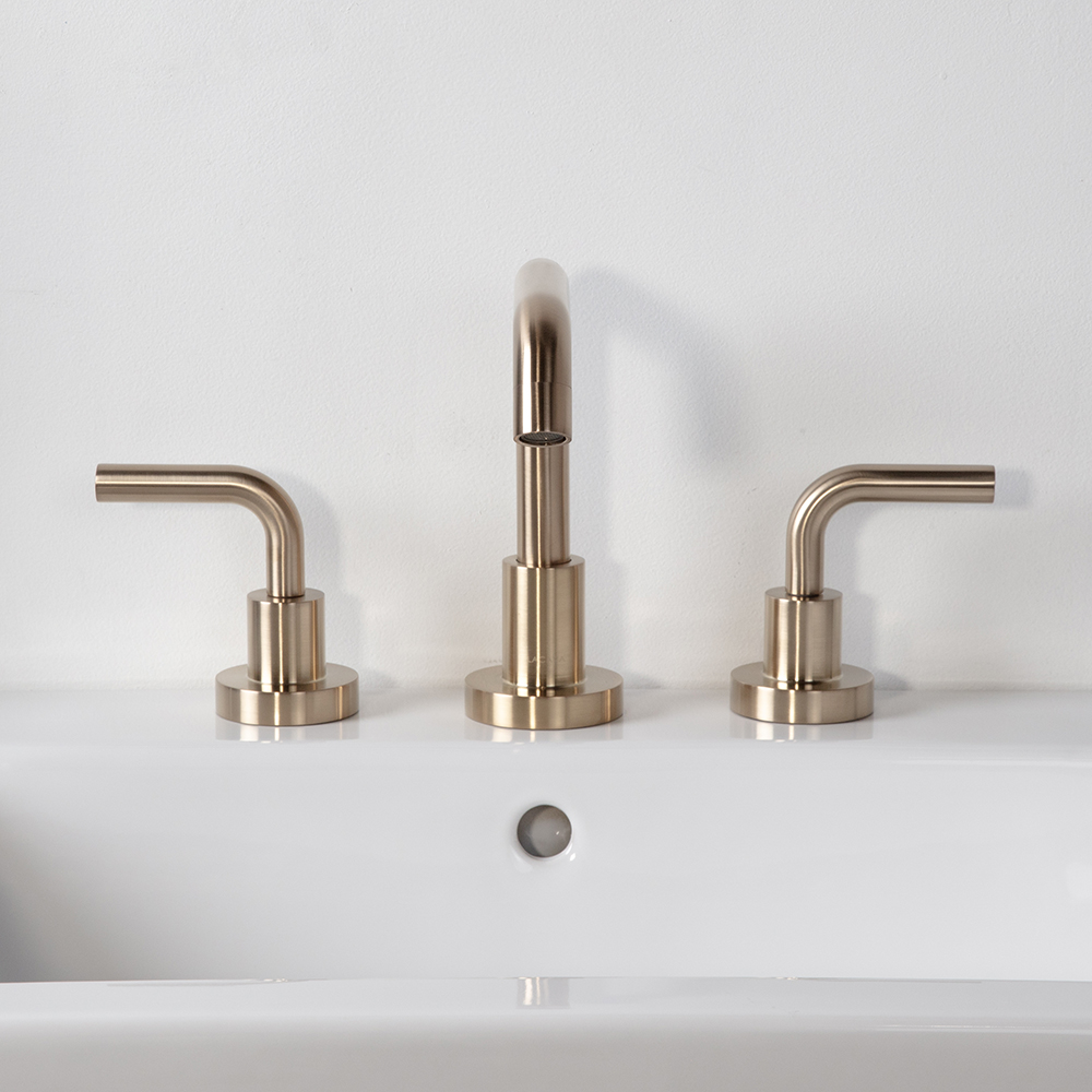 Deck-mount three-hole faucet with a goose-neck swiveling spout, two lever handles, and pop-up drain 7100-17 included. Water flow rate: 1.2 gpm pressure compensating aerator. Shipping class 1.
