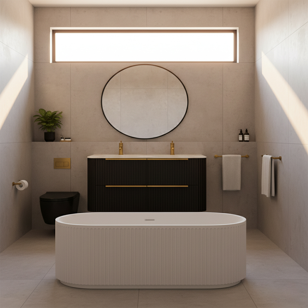 Wall-mount under-counter double vanity with rounded corners, fluted detailing, and four drawers, handmade in our factory in USA by master artisans using the finest quality American woods from 100% natural, renewable forests. Expertly crafted for durability and timeless style, it is designed for use with the FLT-72DT countertop and H270 sinks (sold separately). Includes K131 pulls (installed), with optional FLT-LEG legs available. Shipping Class 5.