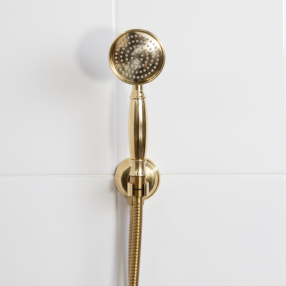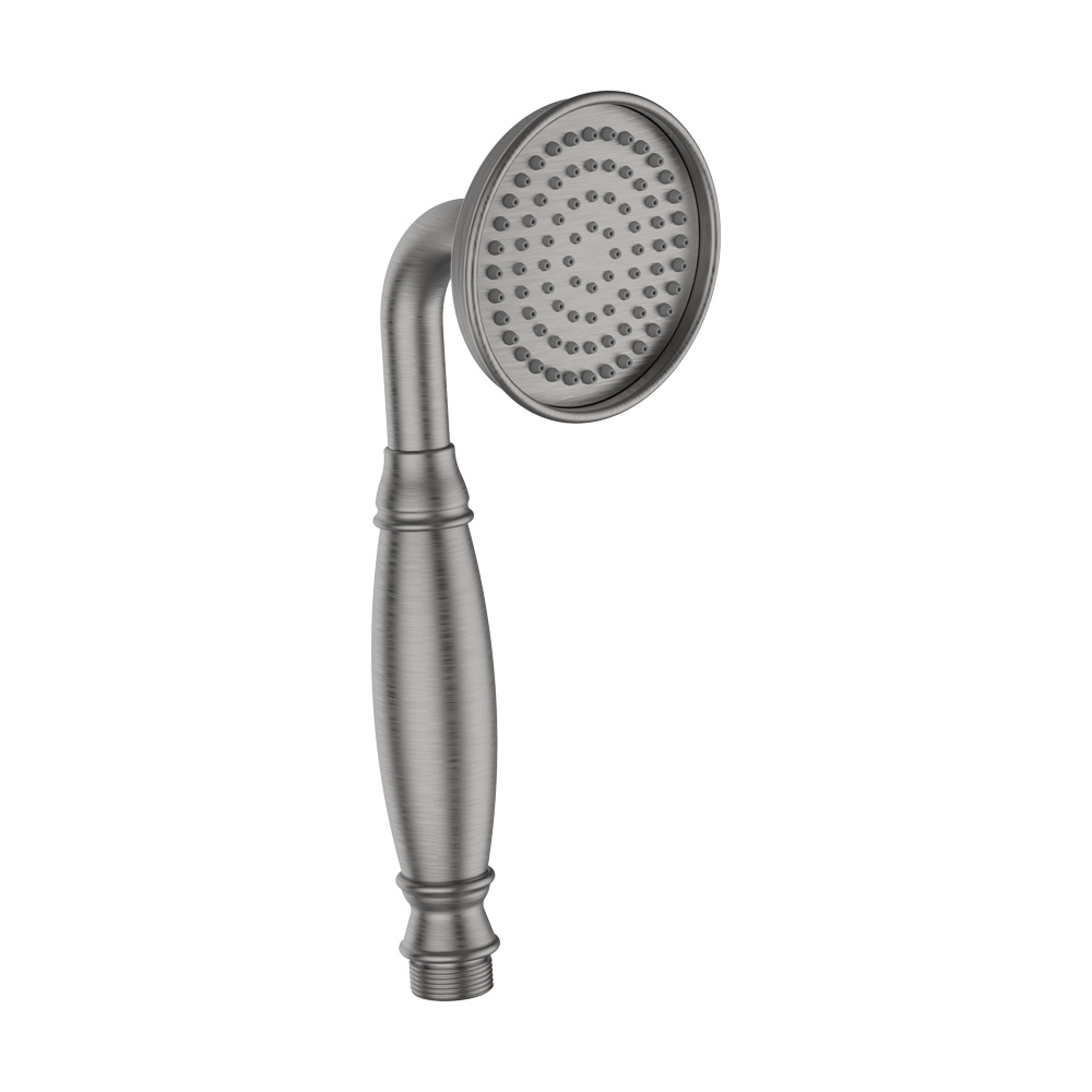 Hand-held round shower head with 59-inch flexible hose, rain jet. Shipping class 1.