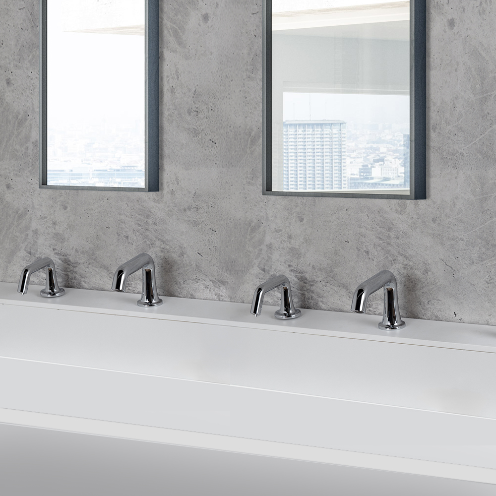 Deck-mount electronic touch-free soap dispenser system with multi-feed soap tank and independent pumps for max 3 spouts. Shipping Class 1.