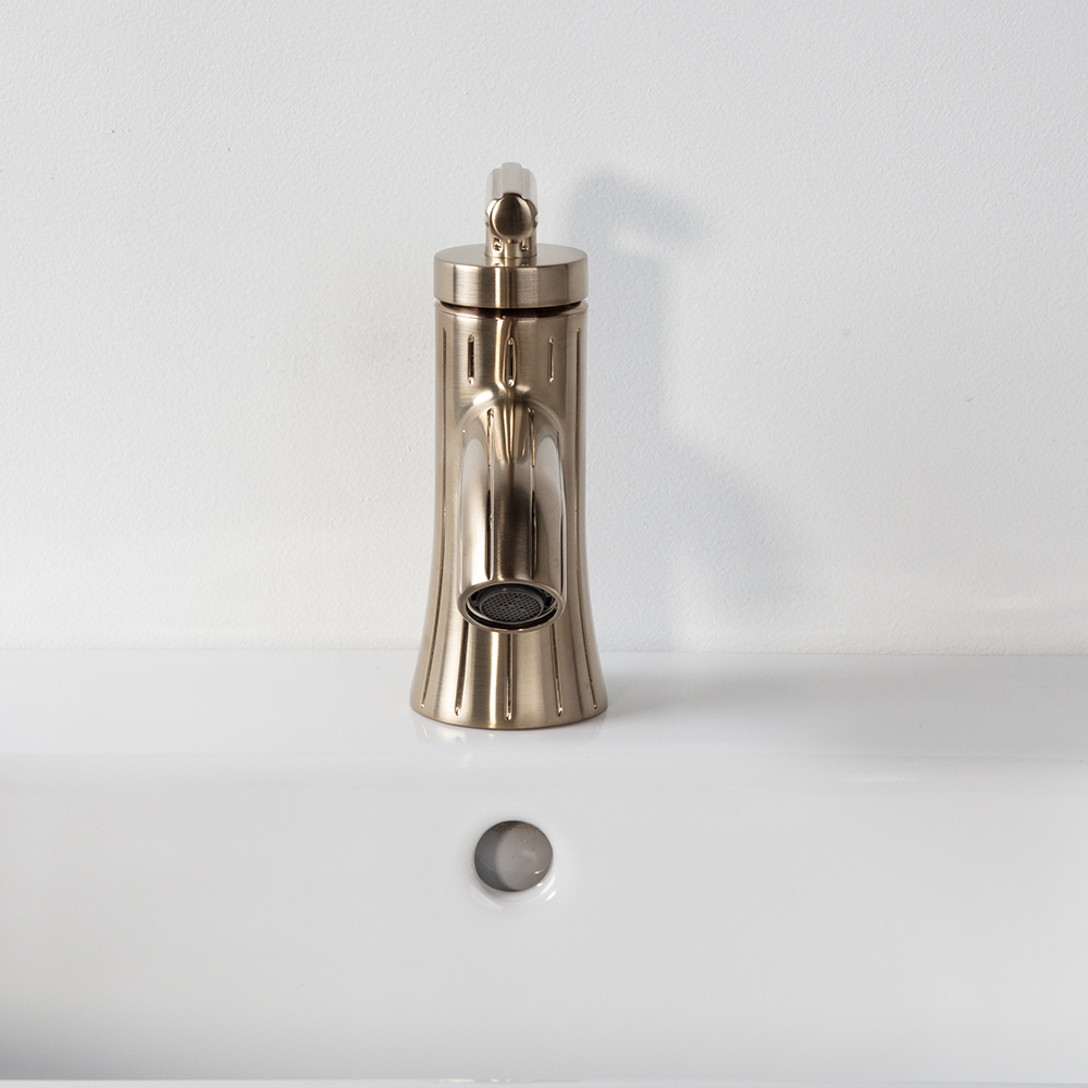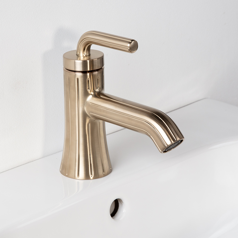 Deck-mount single hole faucet available with or without fluted detailing with J-shaped handle. Click-clack drain 7100-16OF included. Water flow rate: 1.2 gpm at 60 psi. Shipping class 1.