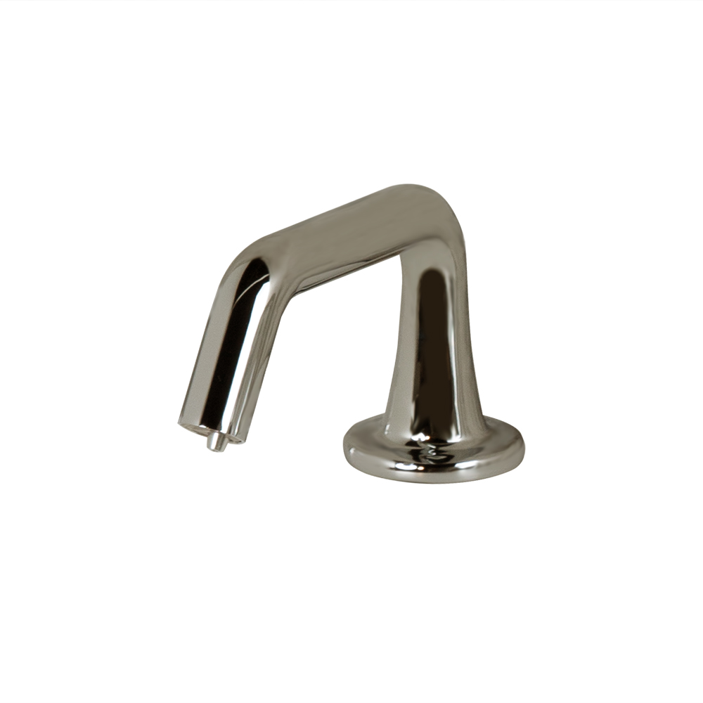 Electronic deck-mounted touch-free soap dispenser with goose-neck spout and bottle kit. AC-DC Input Voltage: 120V, includes transformer and battery pack. Small soap bottle supplied upon request - specify code EXBTS at the time of order. Shipping class 1.