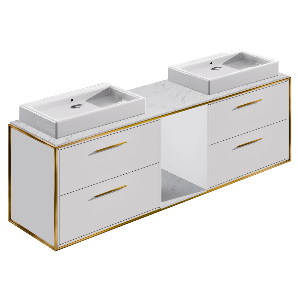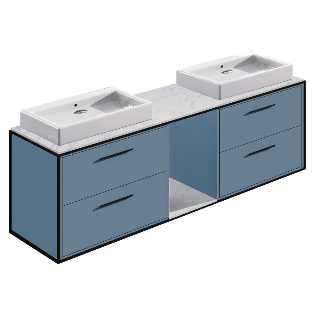 Wall-mount double vanity with four drawers, handmade in our factory in the USA by master artisans using the finest quality American woods from 100% natural, renewable forests. Features a fully welded stainless steel frame, solid surface countertop, and shelf. Pulls are included but not installed (installation available upon request). Shipping Class 4.