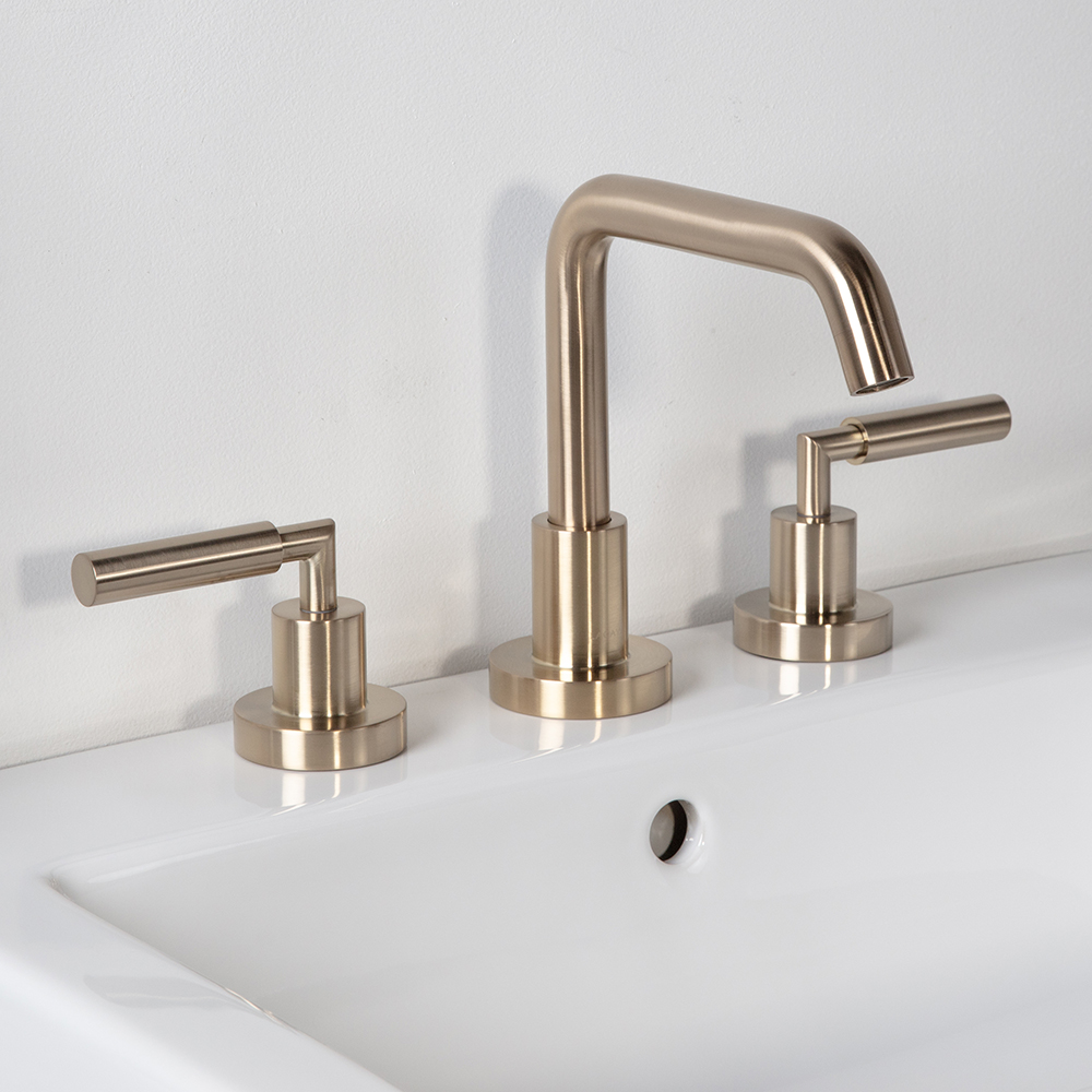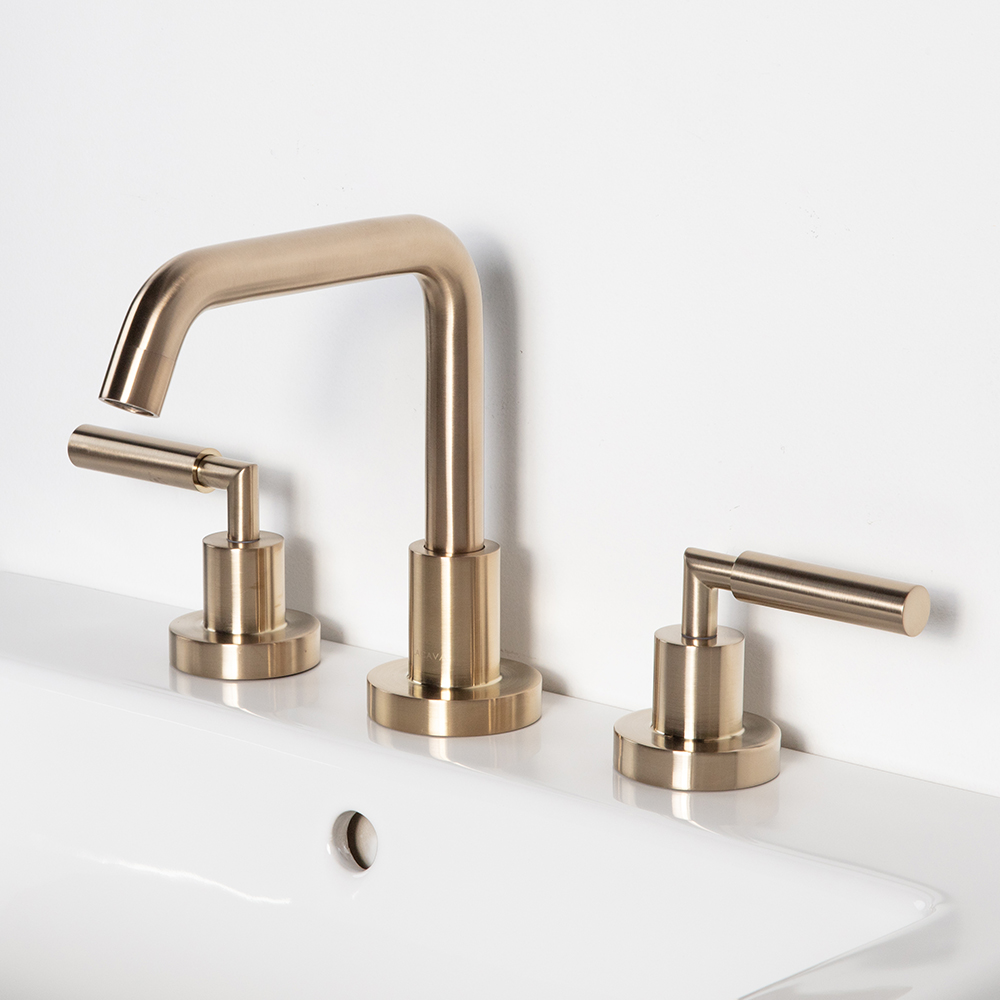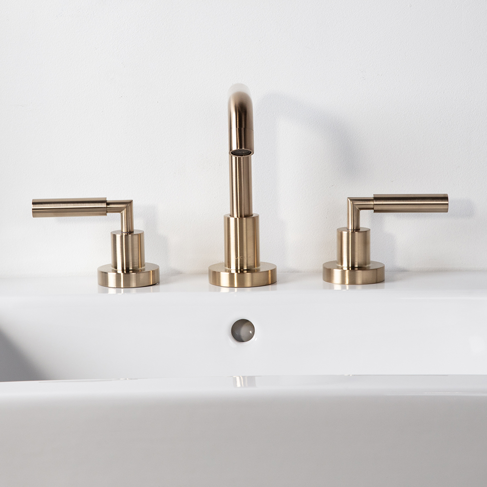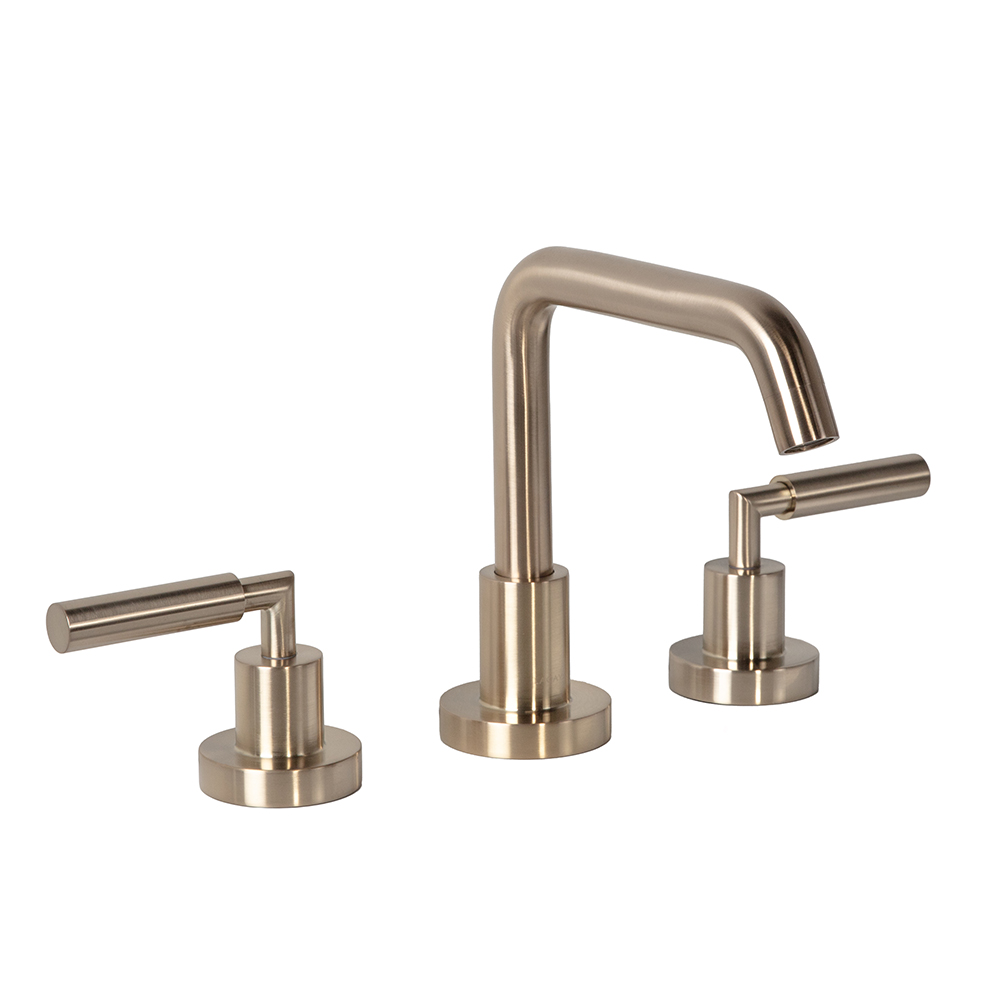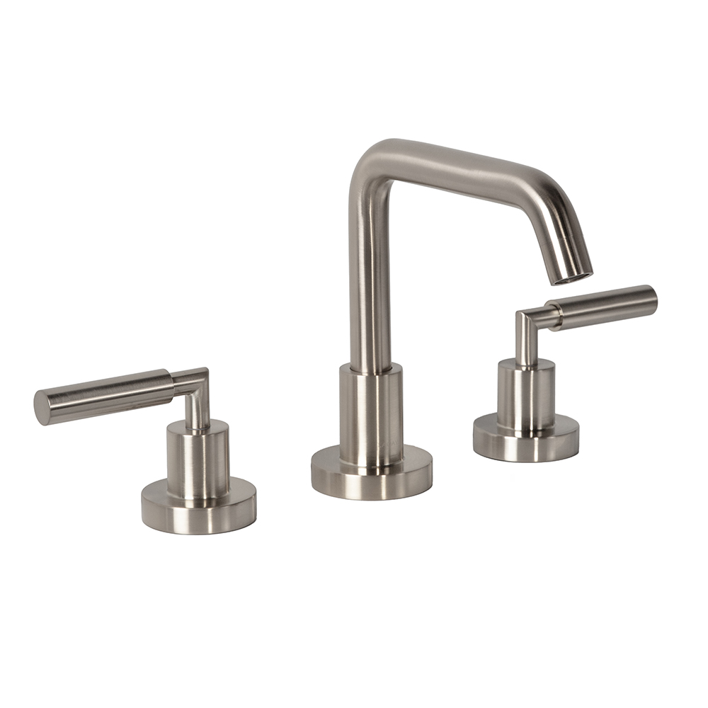 Deck-mount three-hole faucet with a goose-neck swiveling spout, two lever handles, and pop-up drain 7100-17 included. Water flow rate: 1.2 gpm pressure compensating aerator. Shipping class 1.