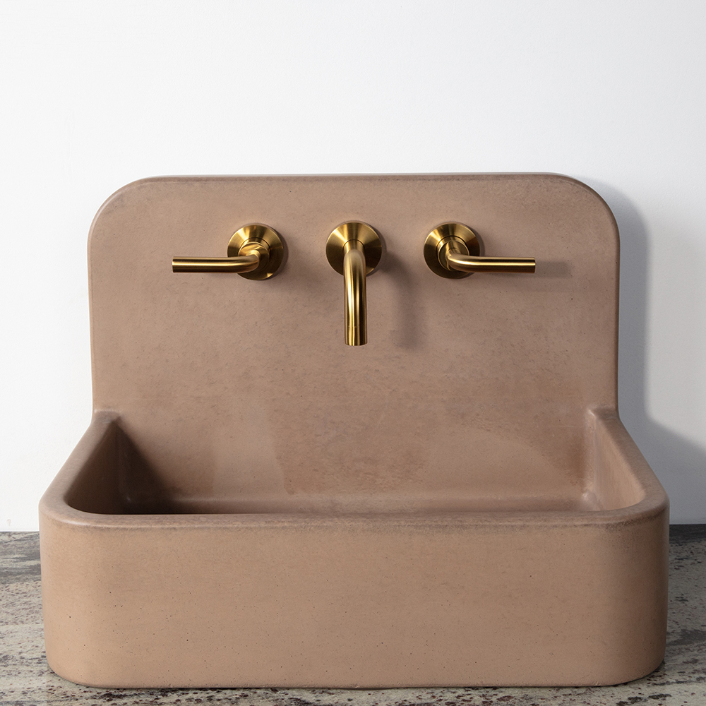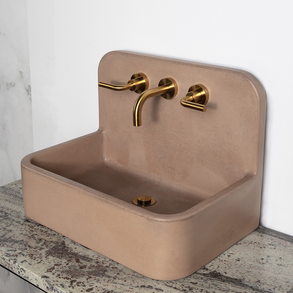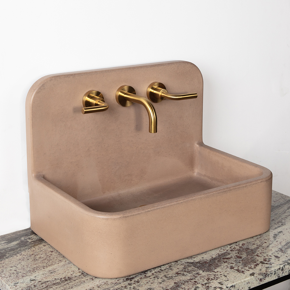 This handmade 22" rectangular concrete sink features an integrated backsplash and is crafted in USA. Designed for wall-mounted (floating) or vanity top installation, it combines sculptural form with functional height for added splash protection. Available exclusively with three faucet holes. No overflow. Wall-mount brackets (BR-ST14 or BR1711) are sold separately and only required for floating installations. Brackets are not needed when installed on a console or countertop. Shipping Class 4.