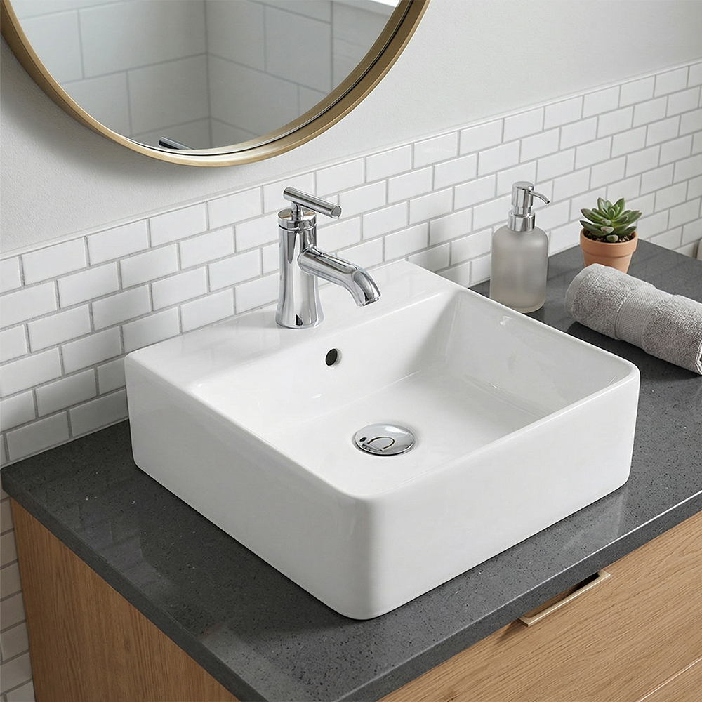 Wall-mount or above-counter porcelain sink with an overflow. Shipping class 2.
