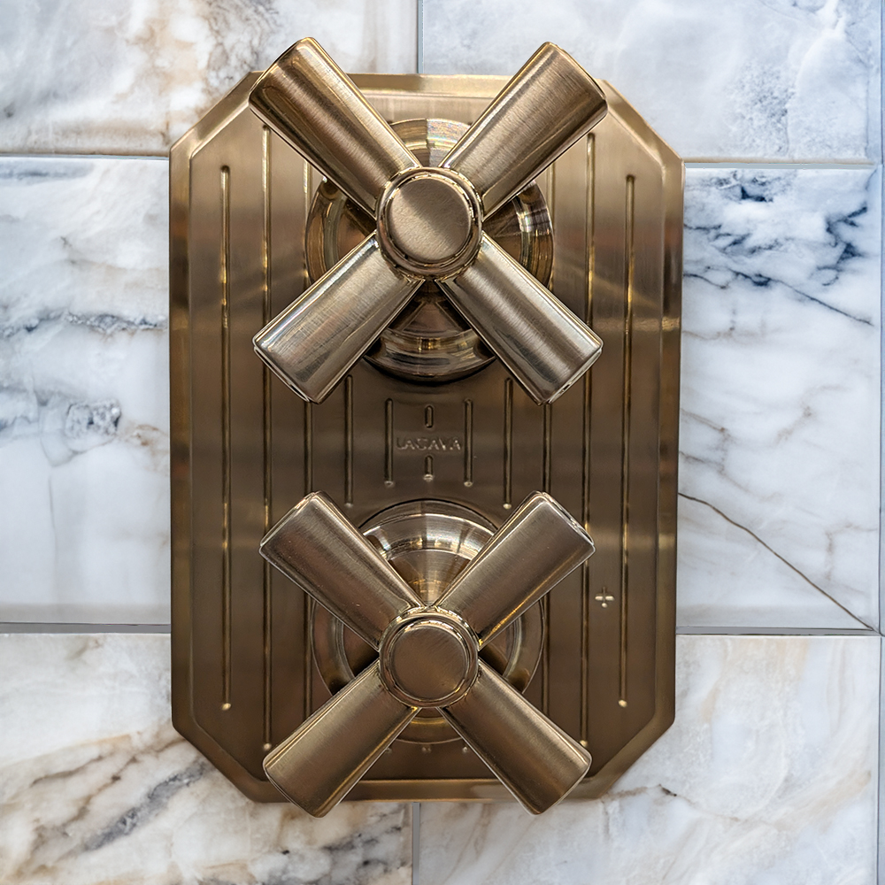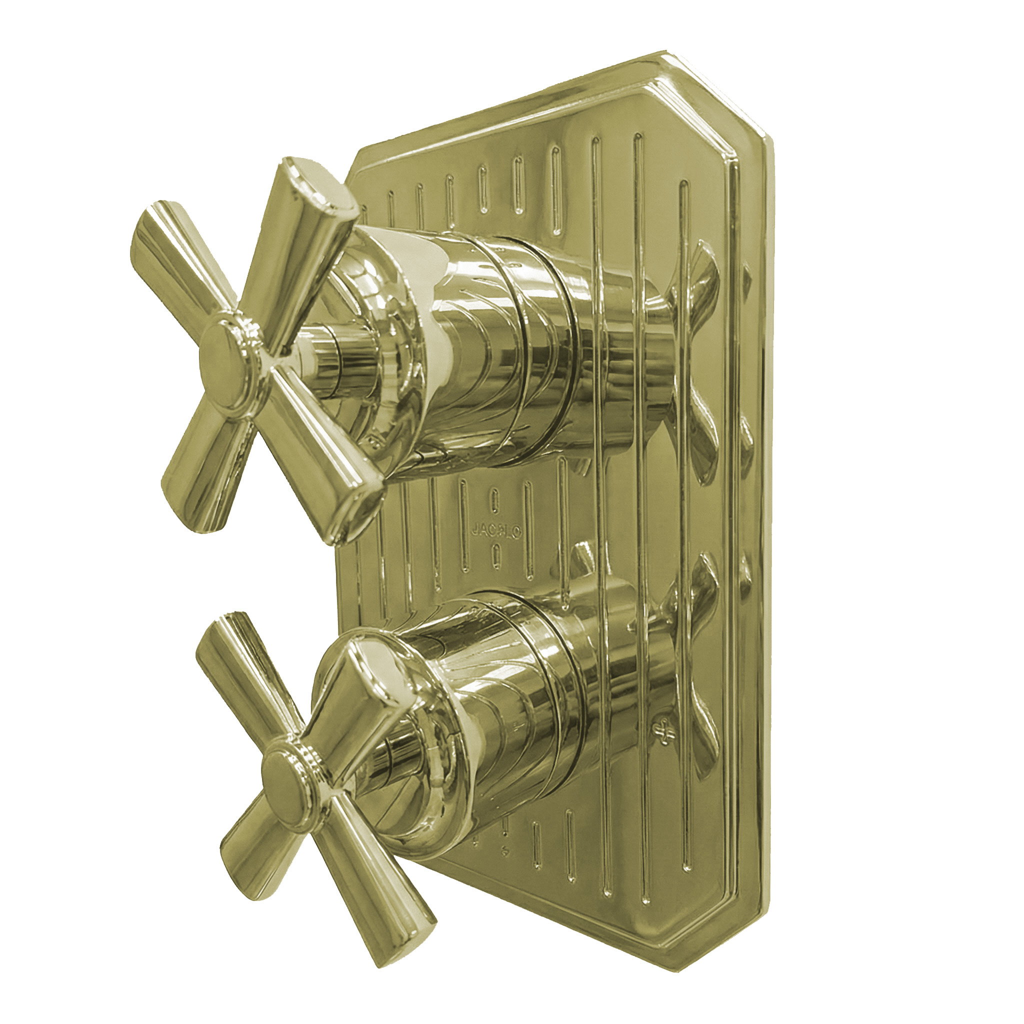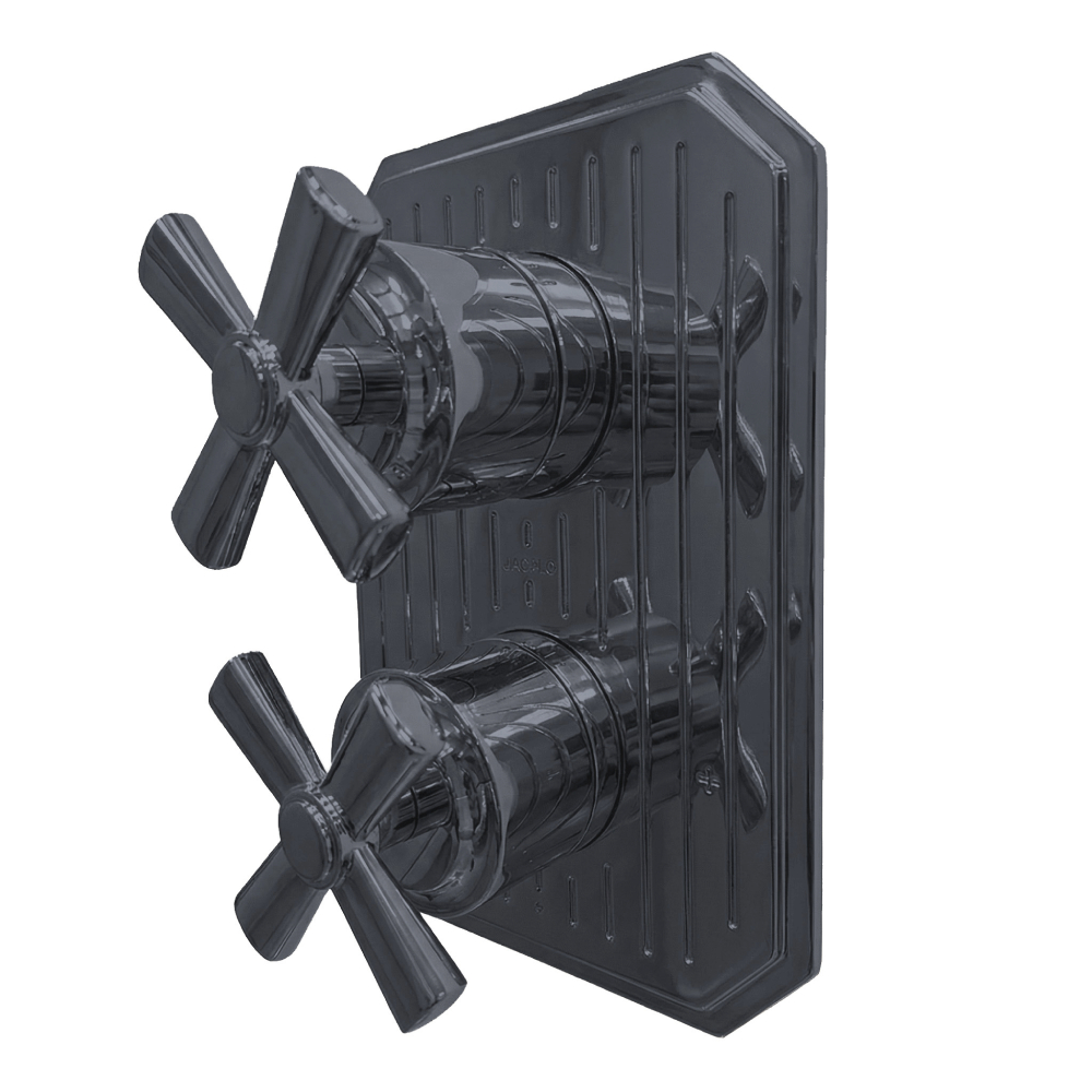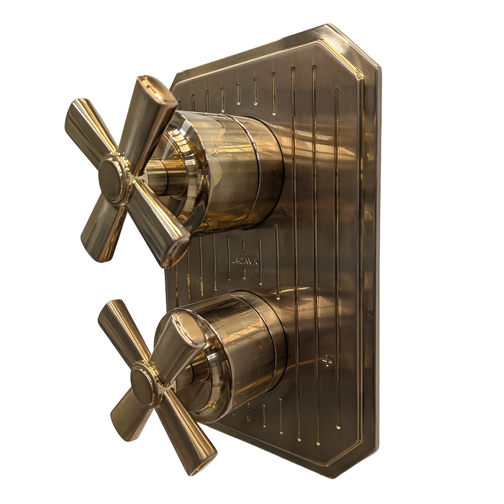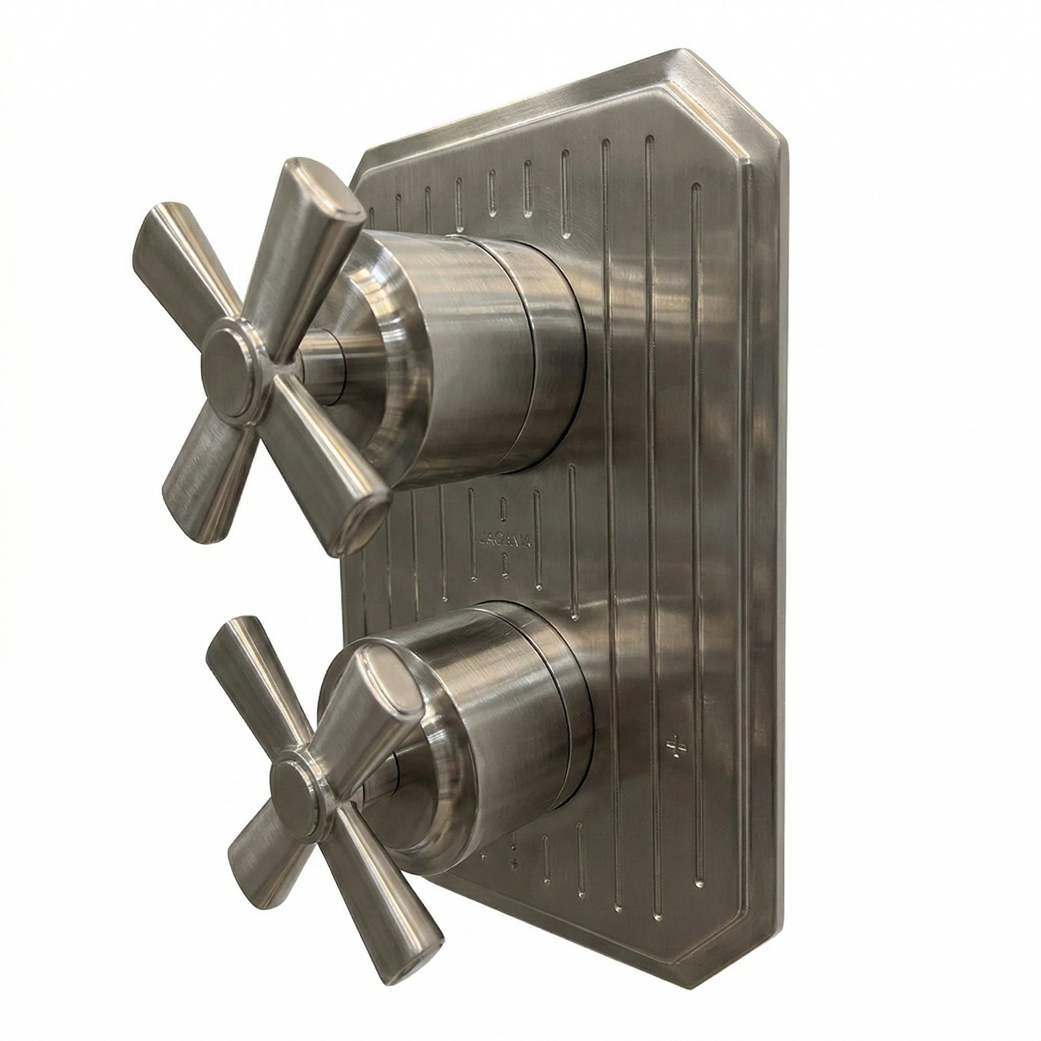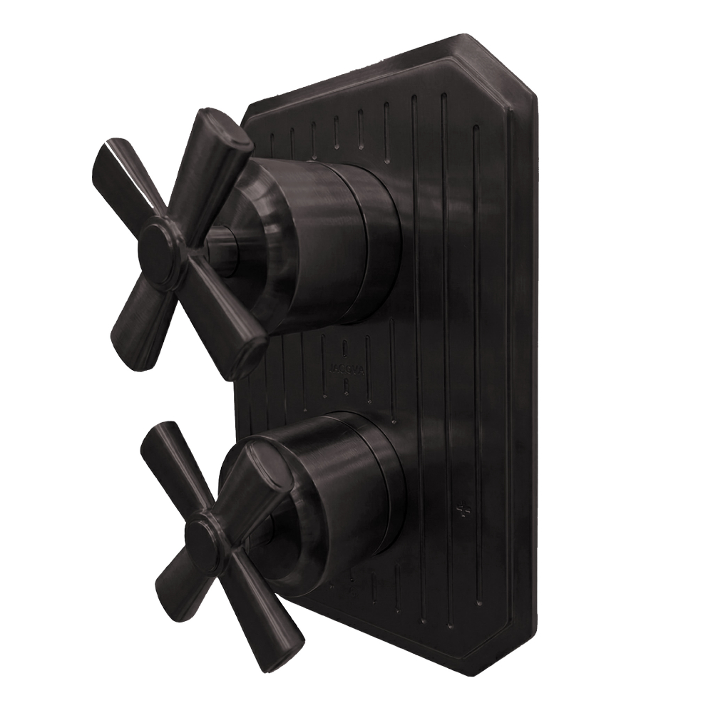 Built-in progressive pressure balancing mixer with 2-way diverter, two cross handles and a rectangular backplate. Water flow rate: 4.2 gpm at 43.5 psi. Rough-in and trim sold separately. Shipping class 1.