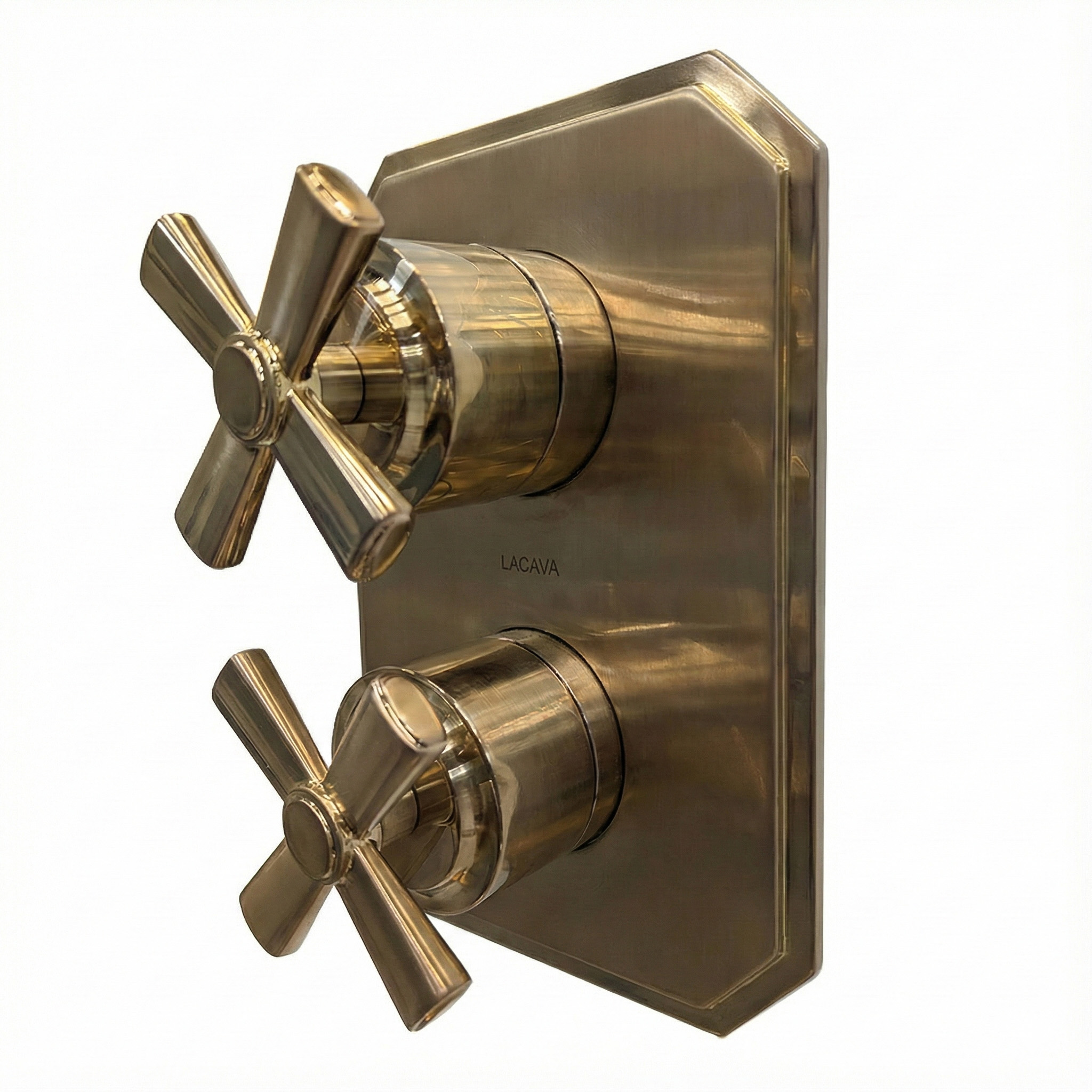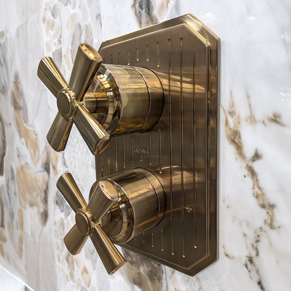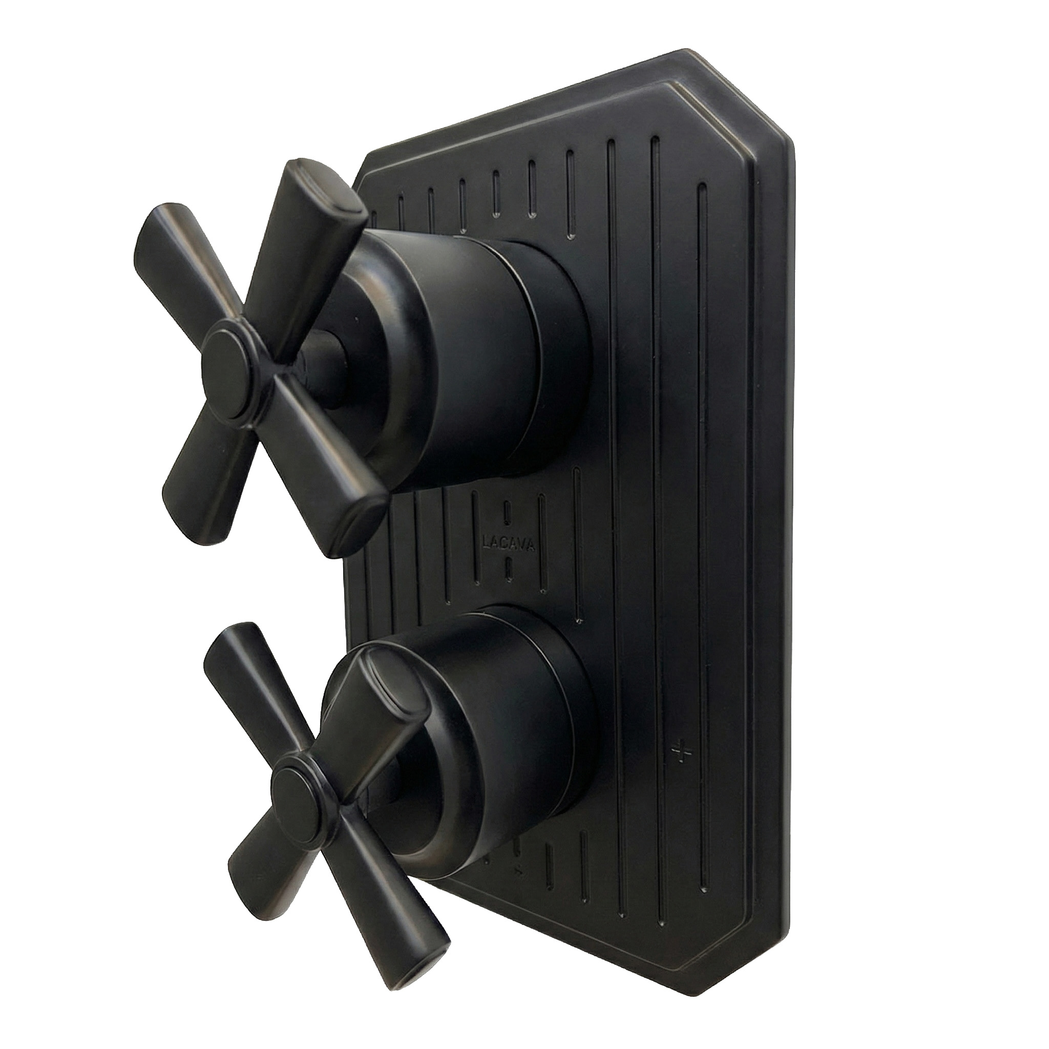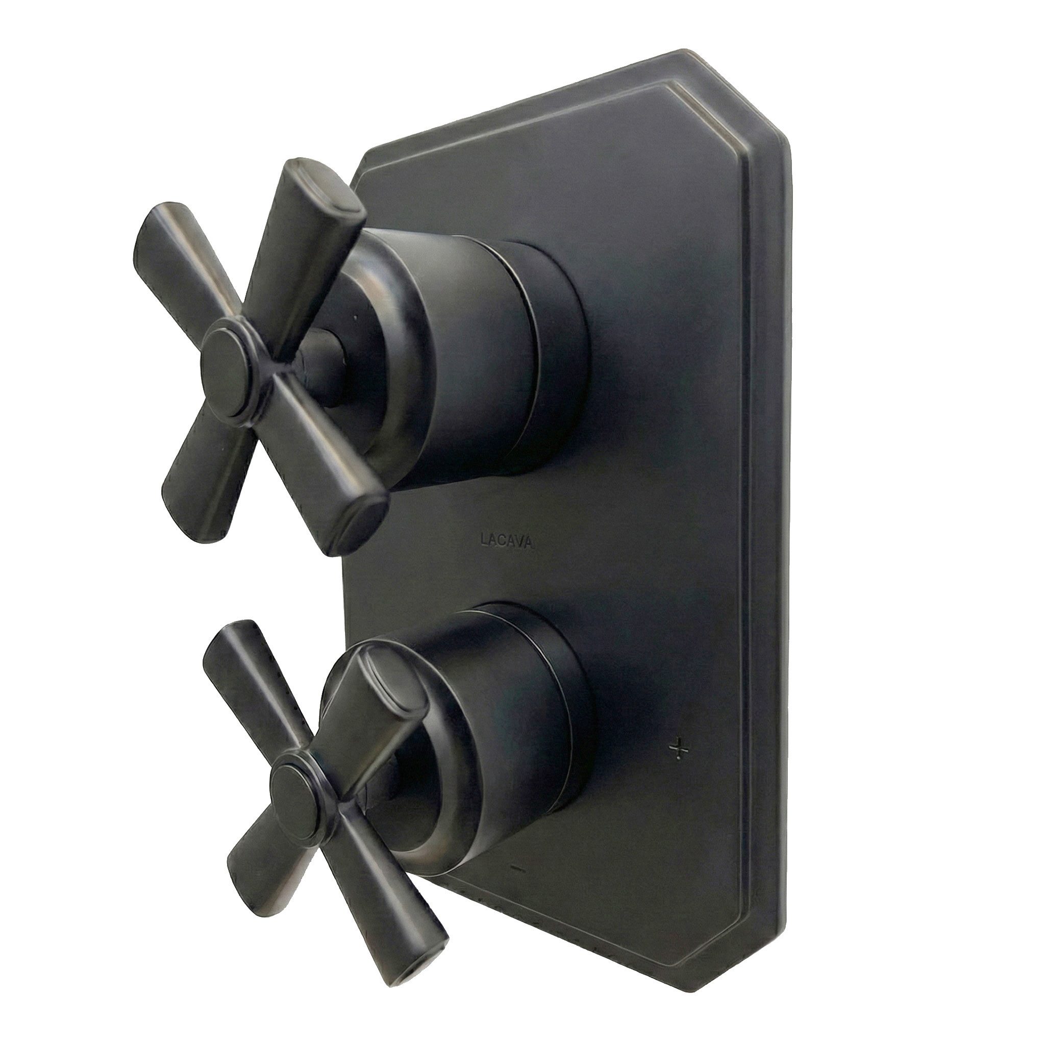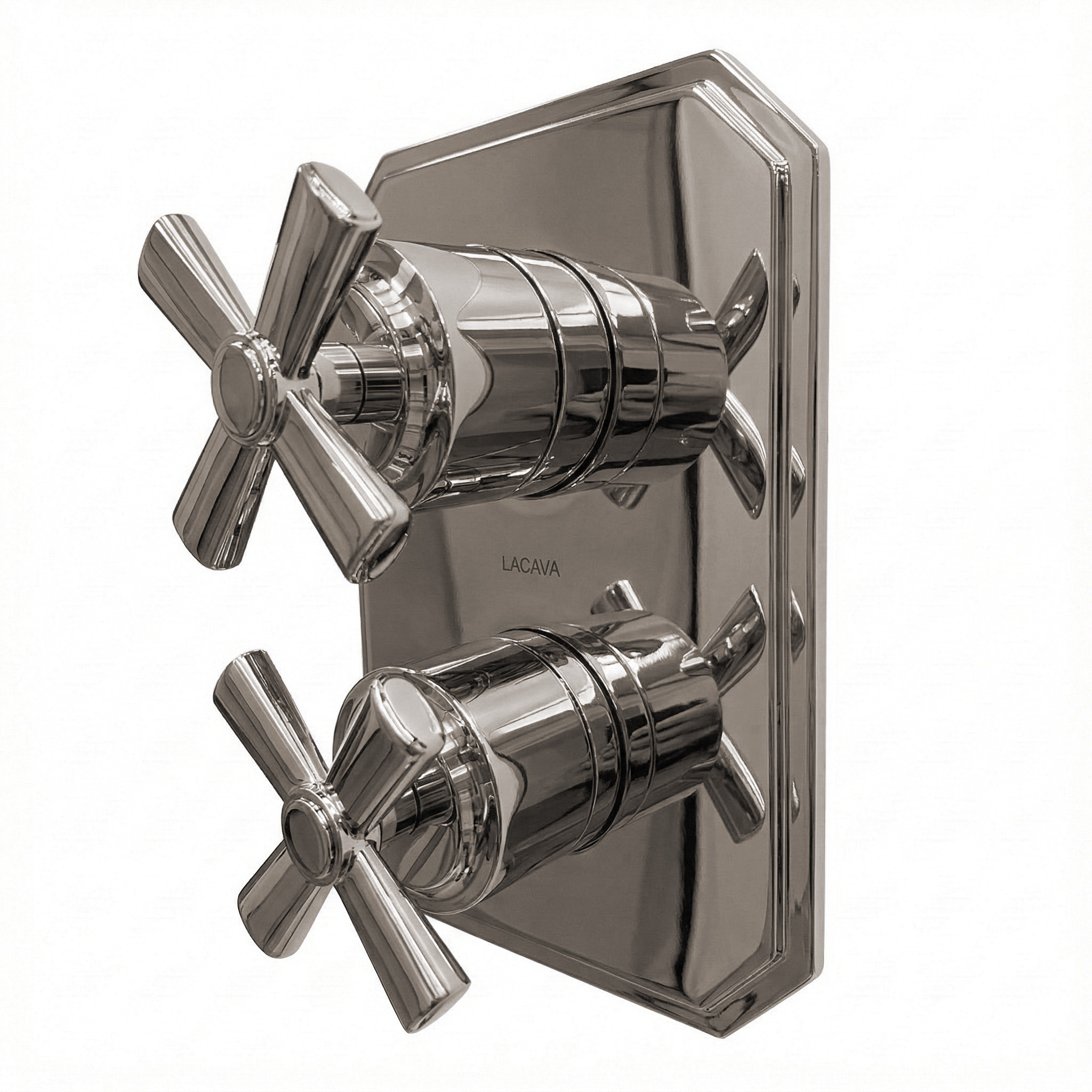 Built-in progressive pressure balancing mixer with 2-way diverter, two cross handles and a rectangular backplate. Water flow rate: 4.2 gpm at 43.5 psi. Rough-in and trim sold separately. Shipping class 1.