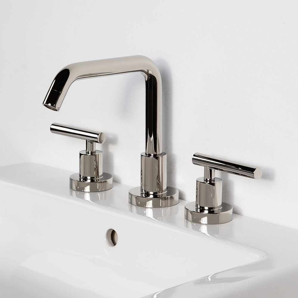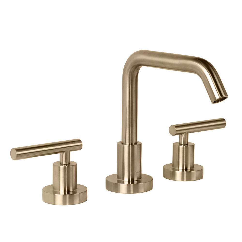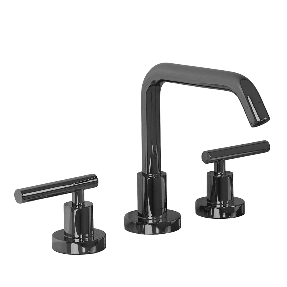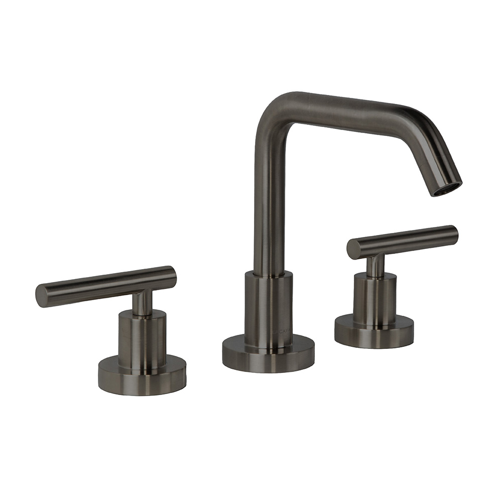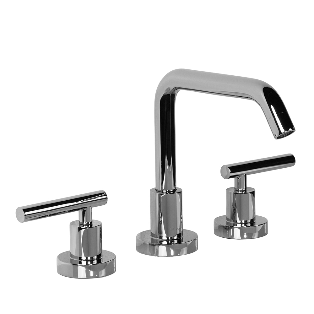 Deck-mount three-hole faucet with a goose-neck swiveling spout, two lever handles, and pop-up drain 7100-17 included. Water flow rate: 1.2 gpm pressure compensating aerator. Shipping class 1.