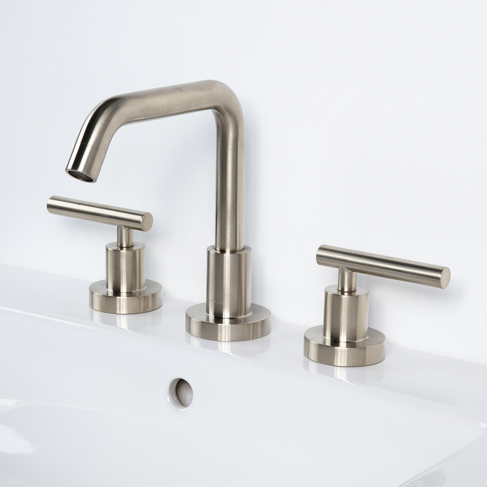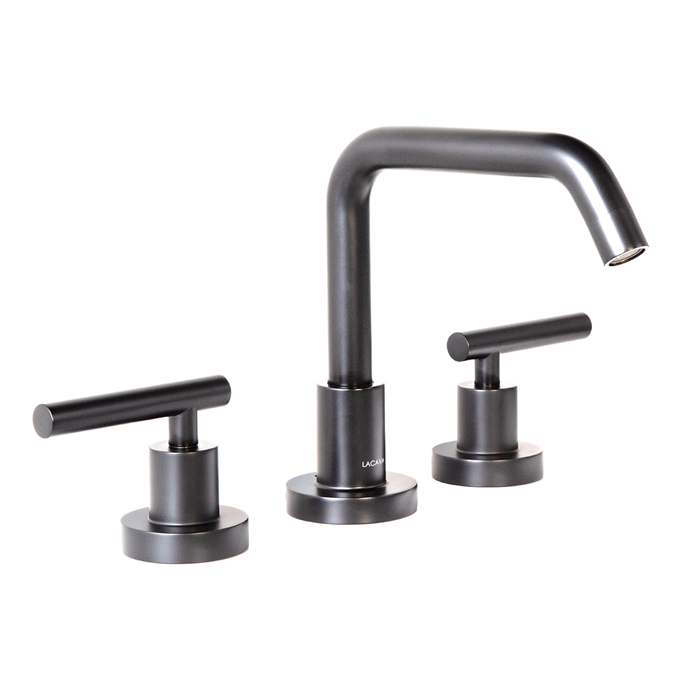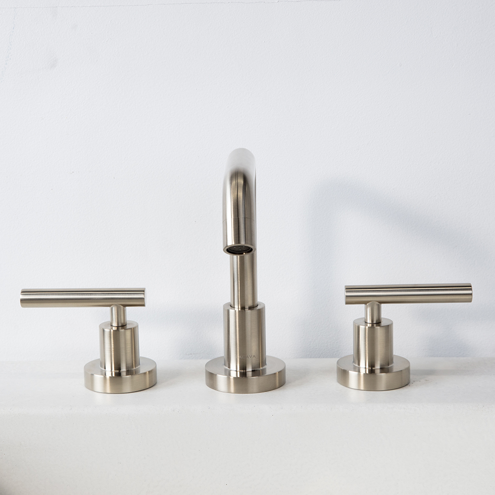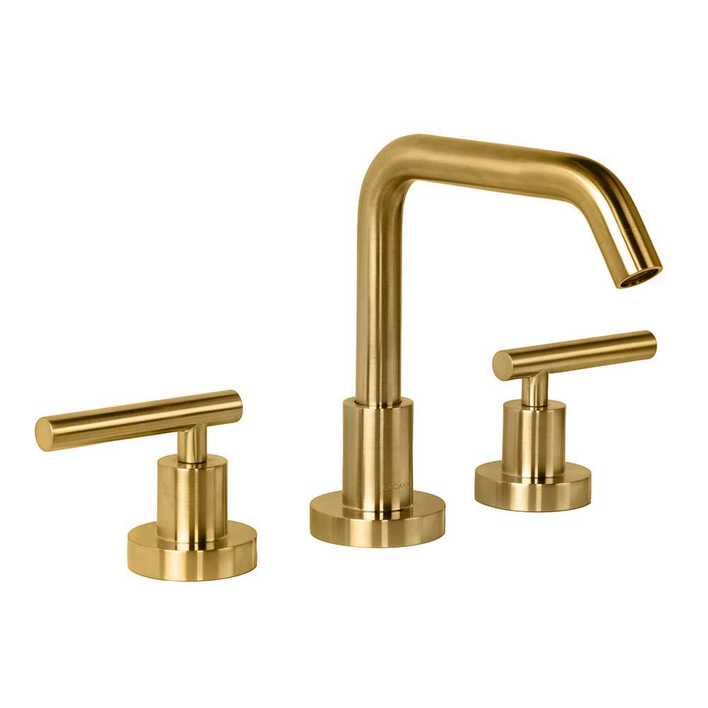 Deck-mount three-hole faucet with a goose-neck swiveling spout, two lever handles, and pop-up drain 7100-17 included. Water flow rate: 1.2 gpm pressure compensating aerator. Shipping class 1.