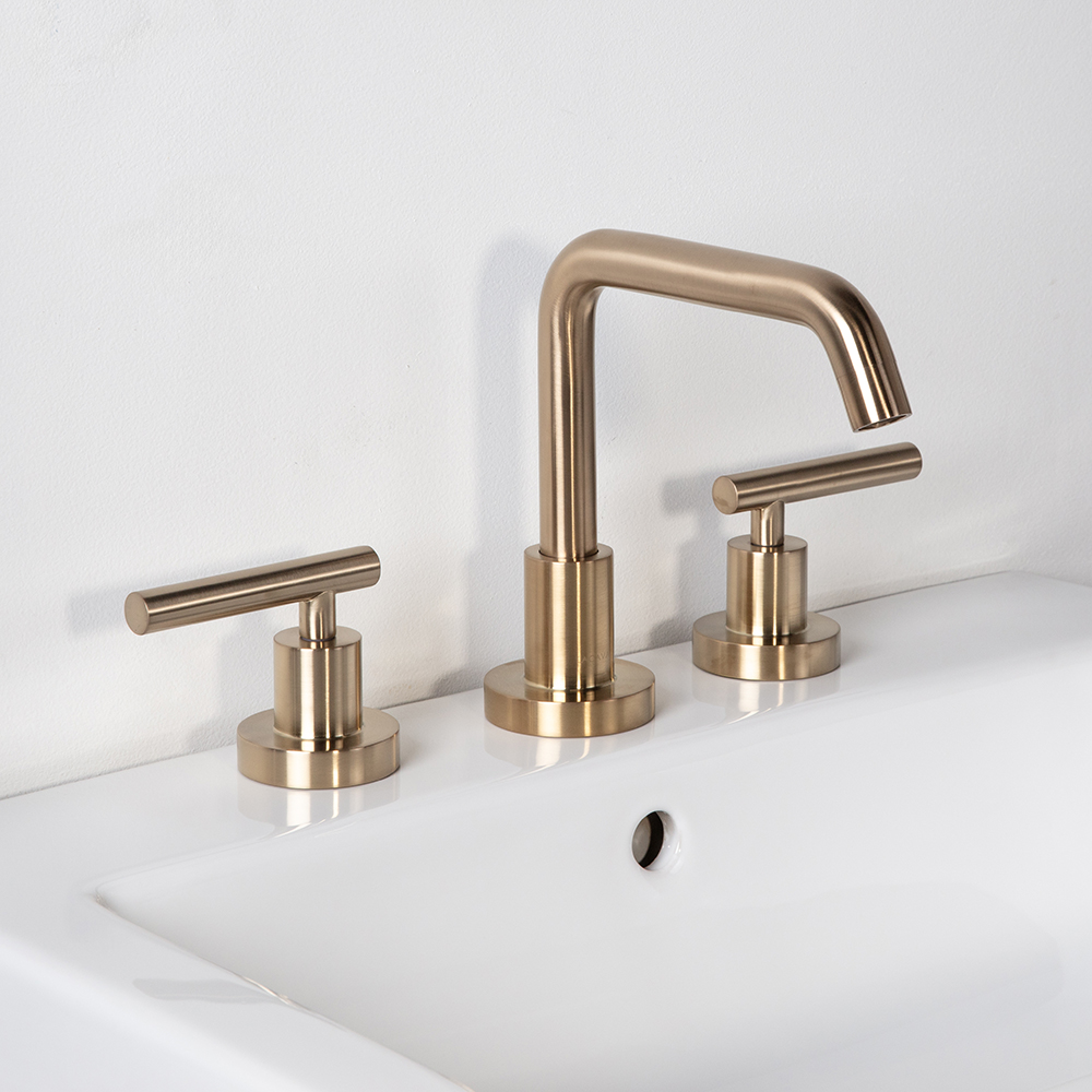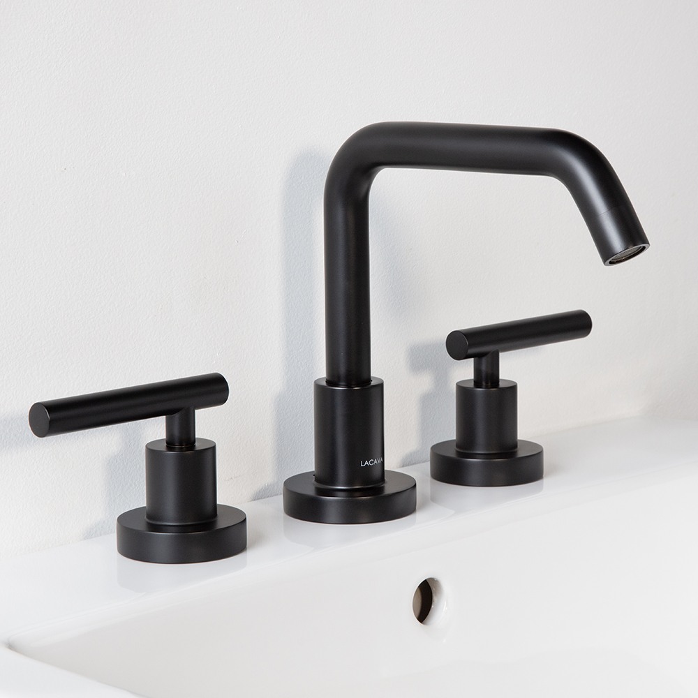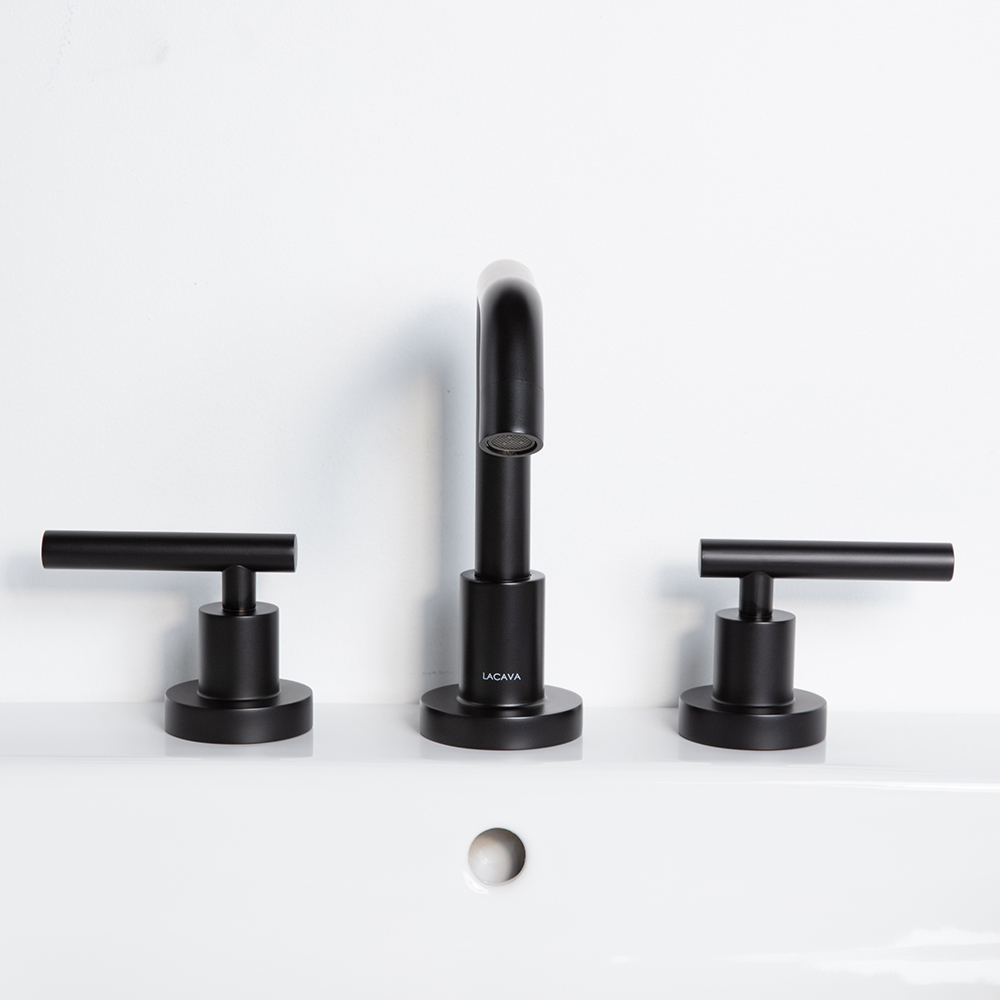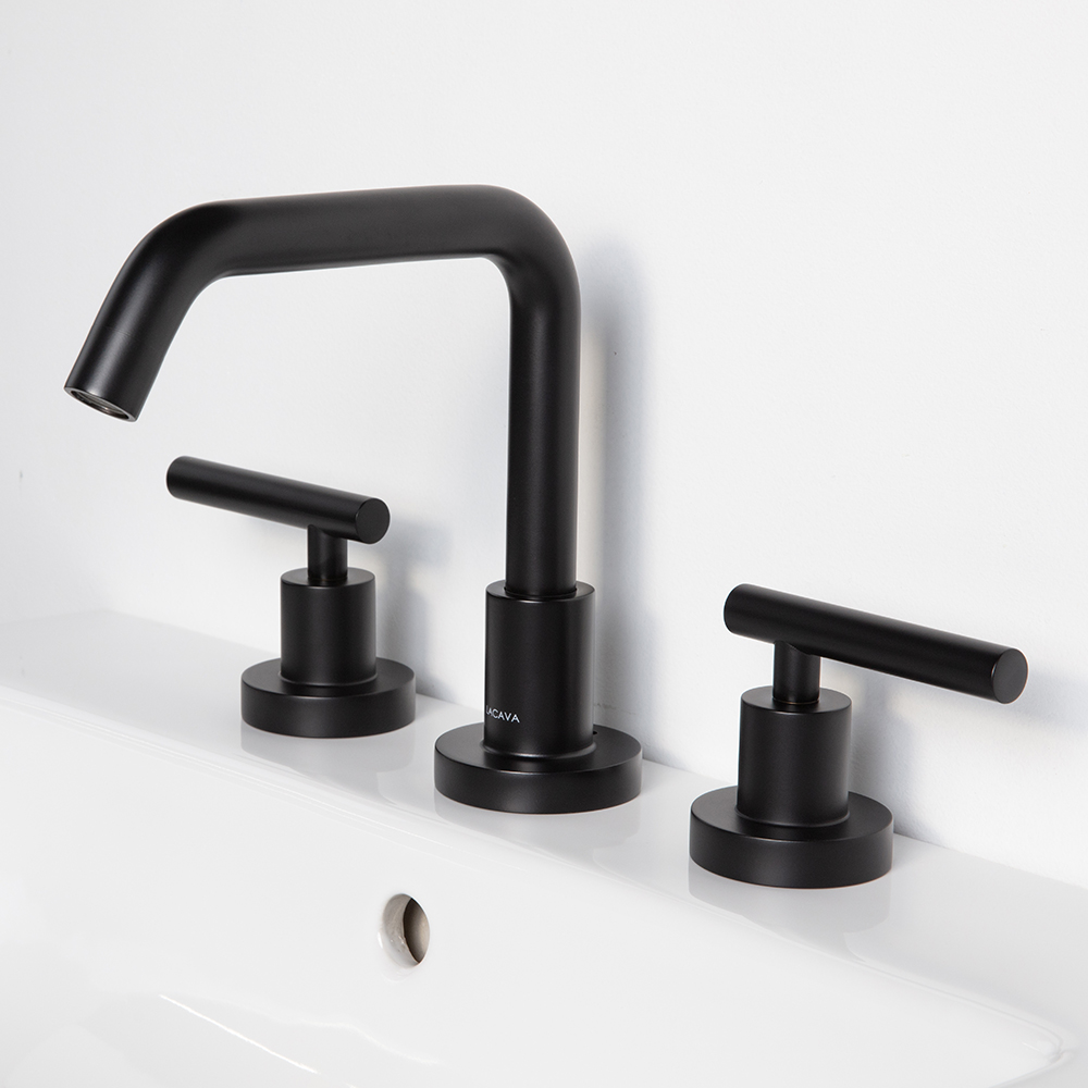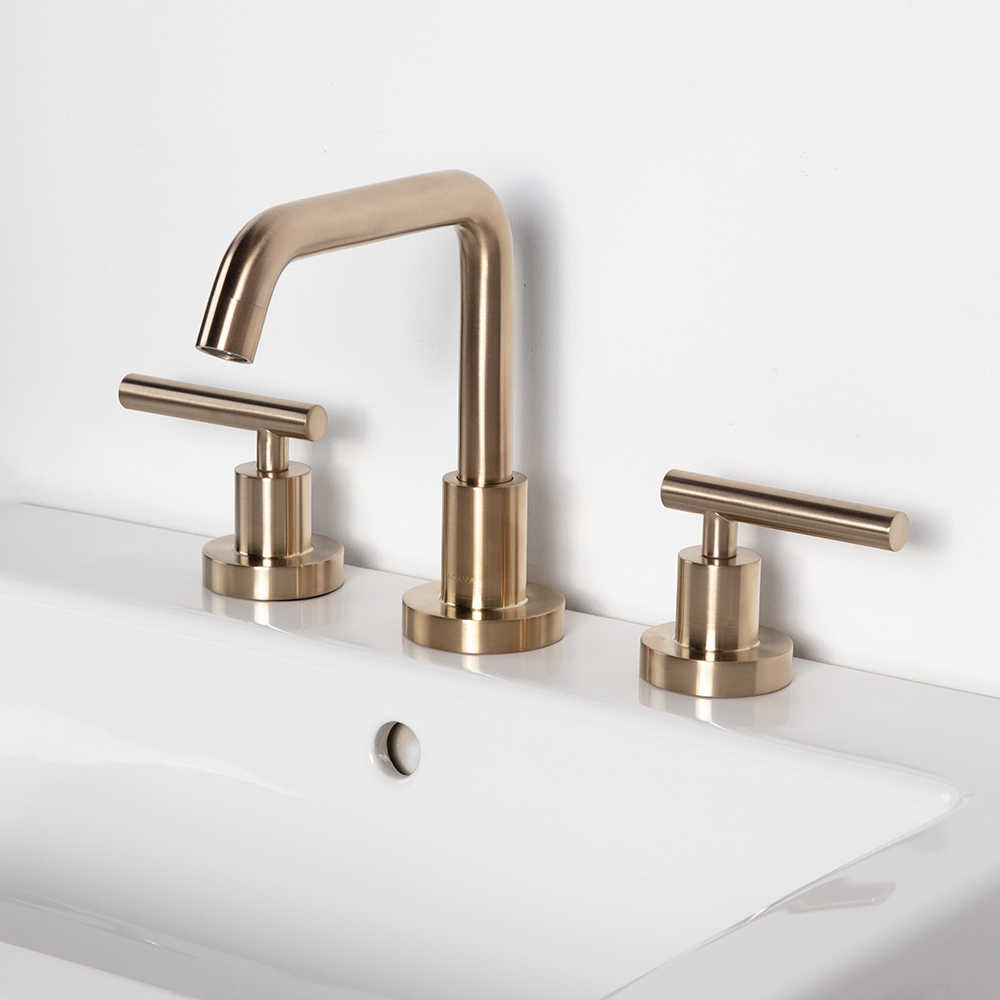 Deck-mount three-hole faucet with a goose-neck swiveling spout, two lever handles, and pop-up drain 7100-17 included. Water flow rate: 1.2 gpm pressure compensating aerator. Shipping class 1.