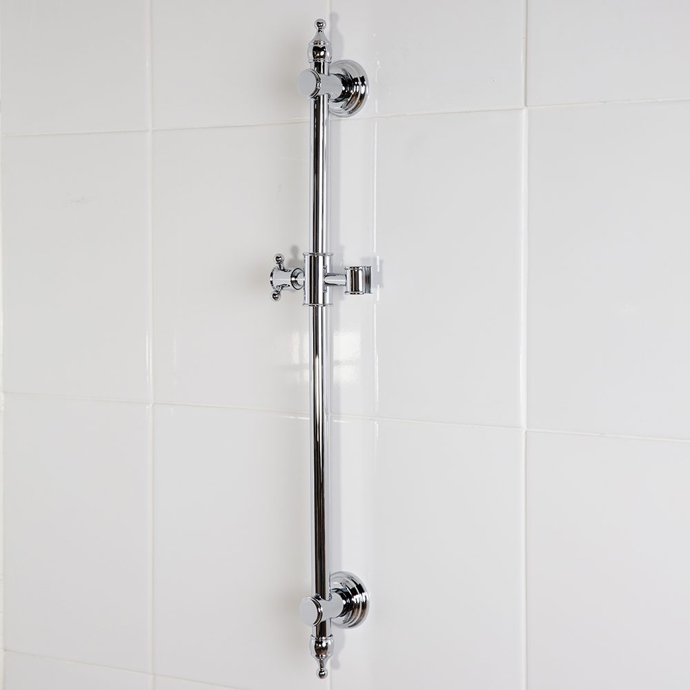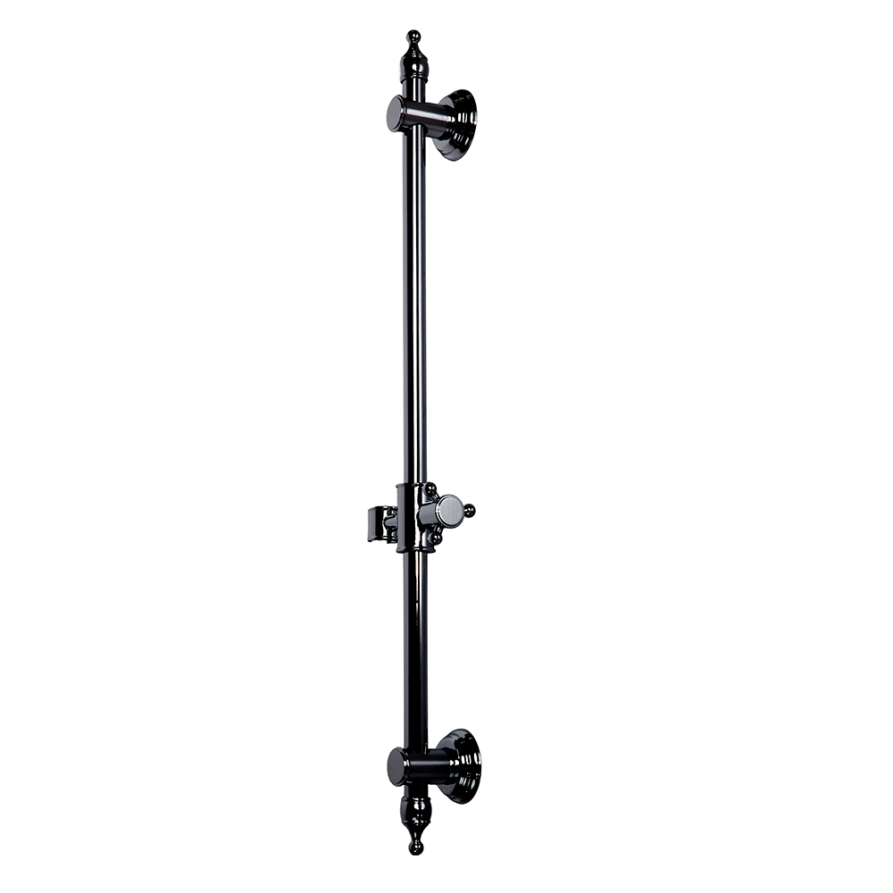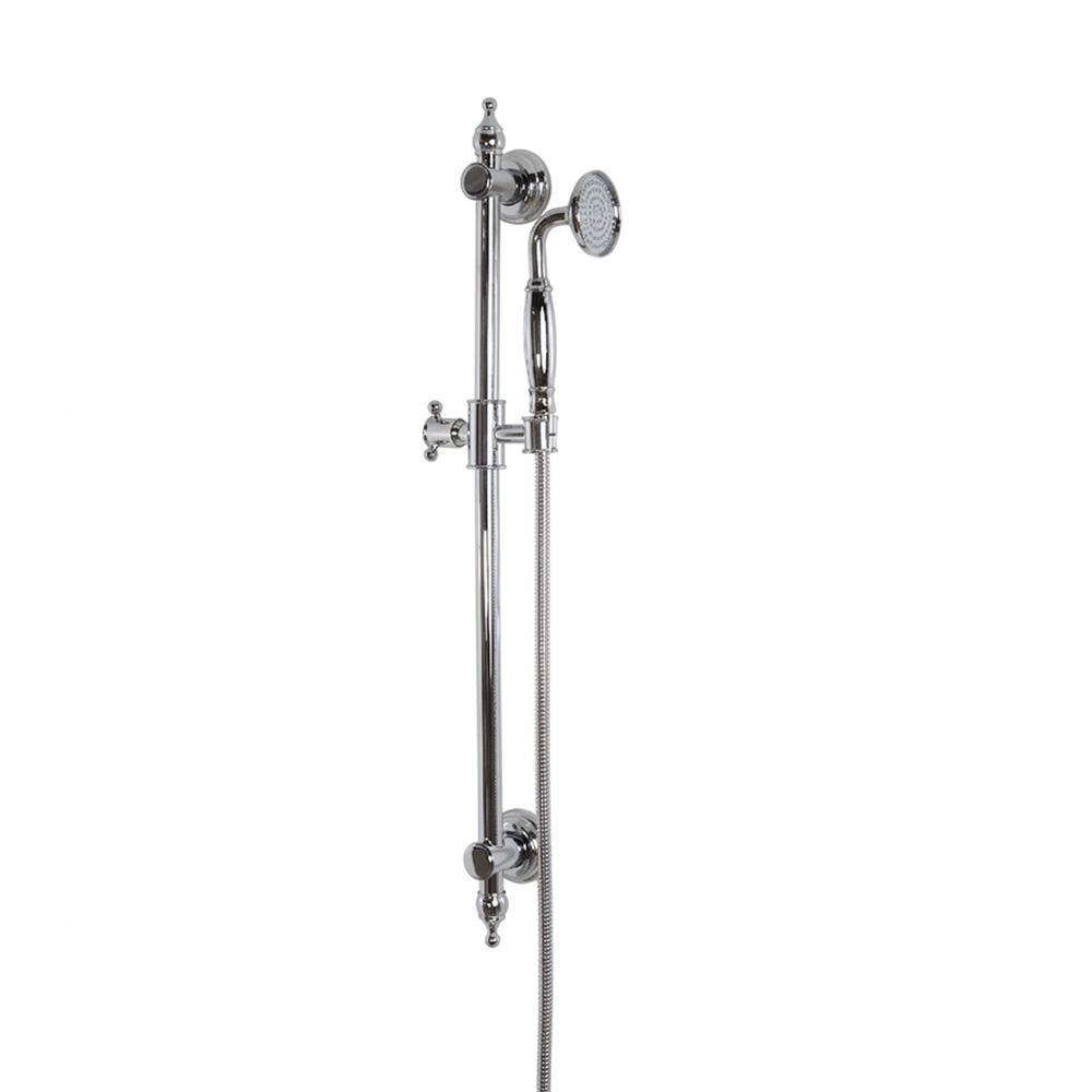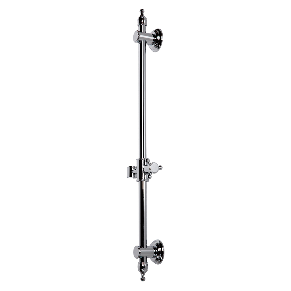 Wall-mount round rail with hook for hand-held shower head. Shipping class 1.