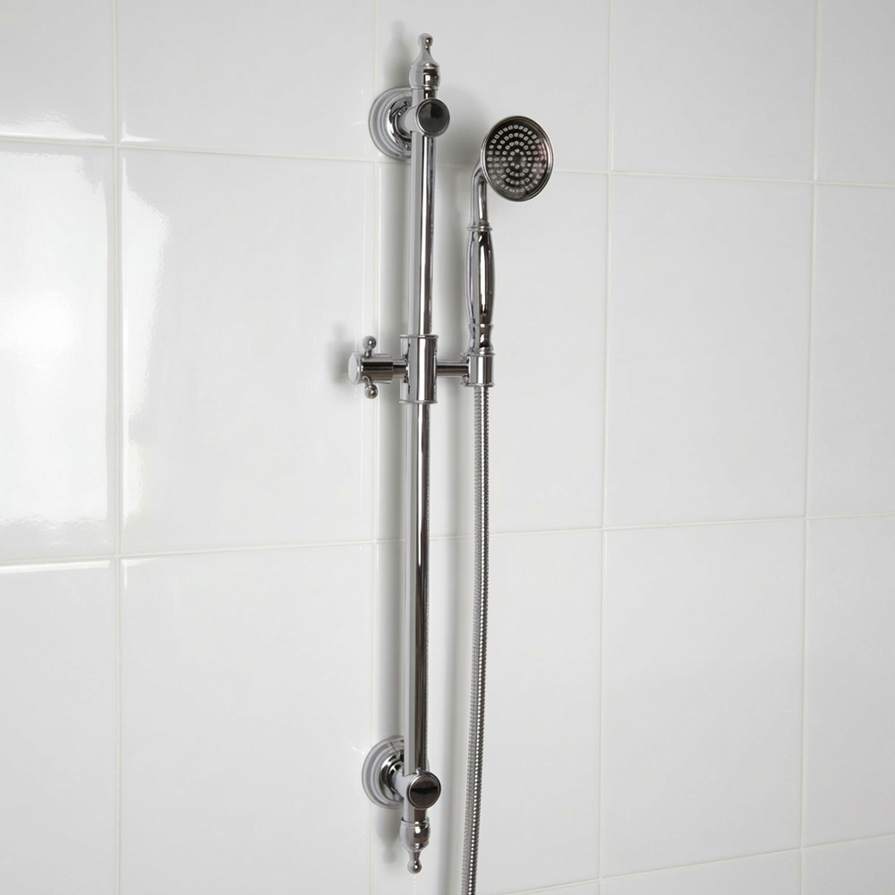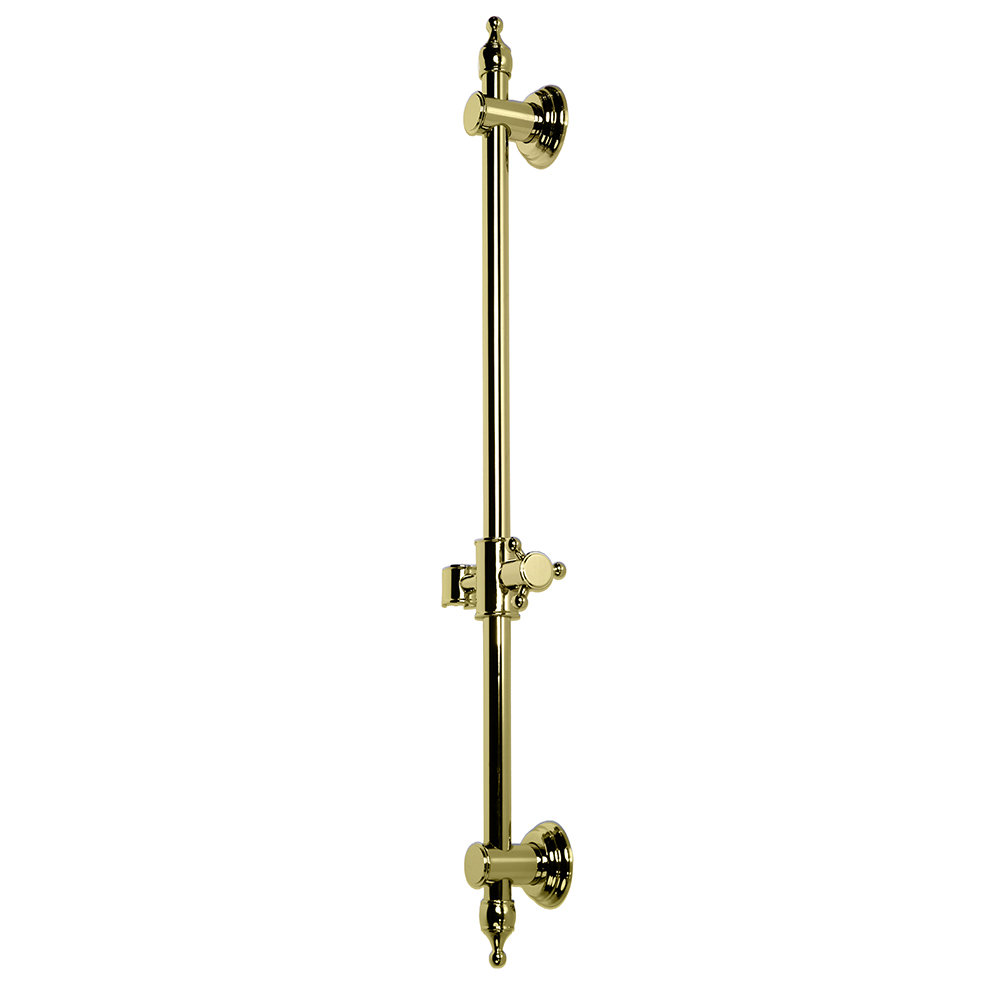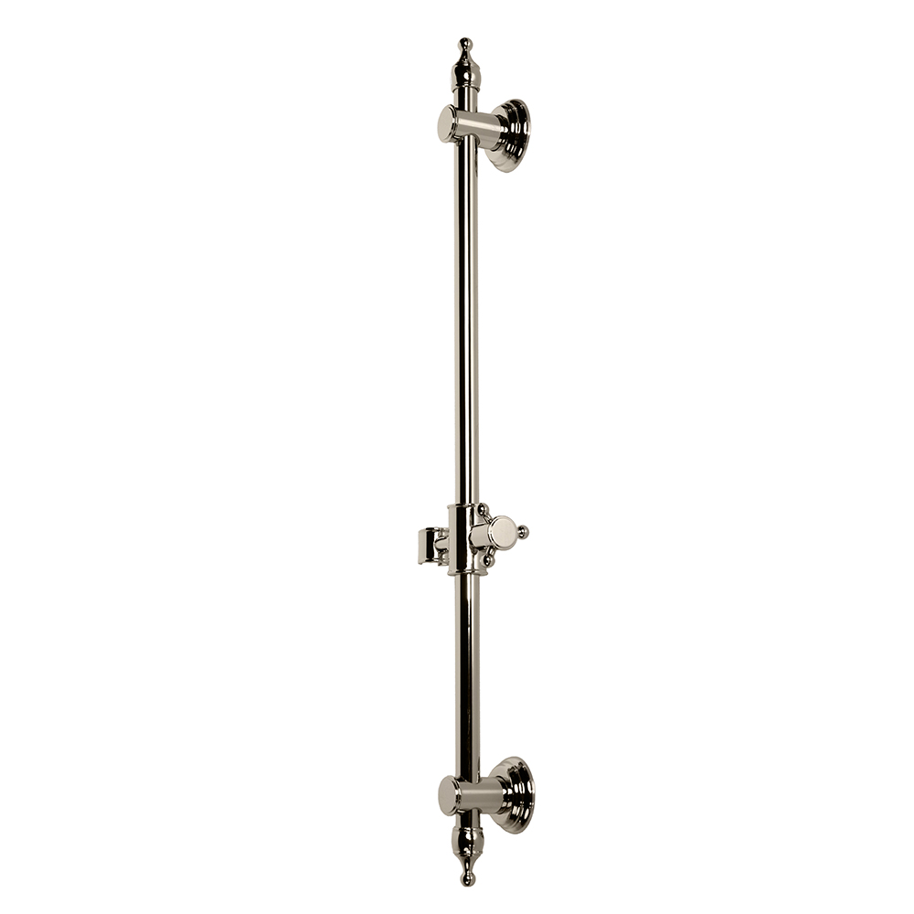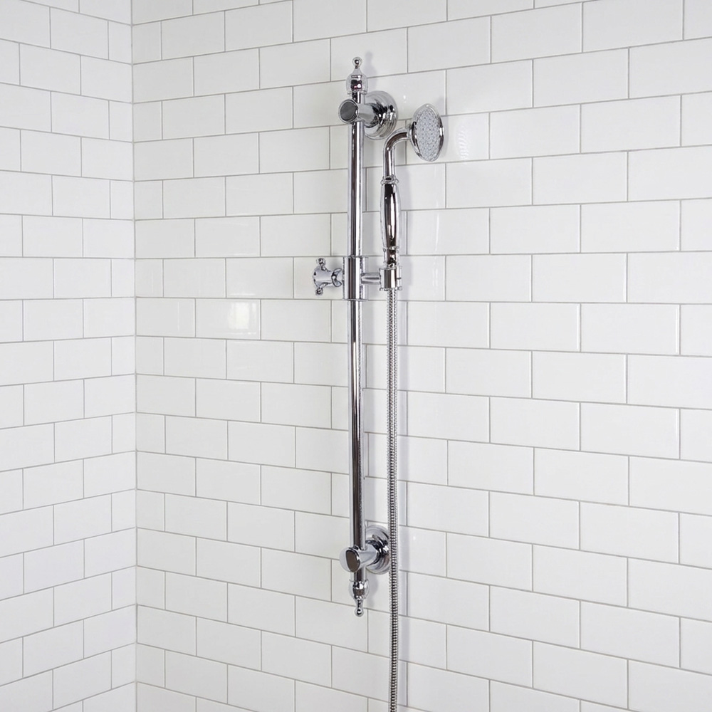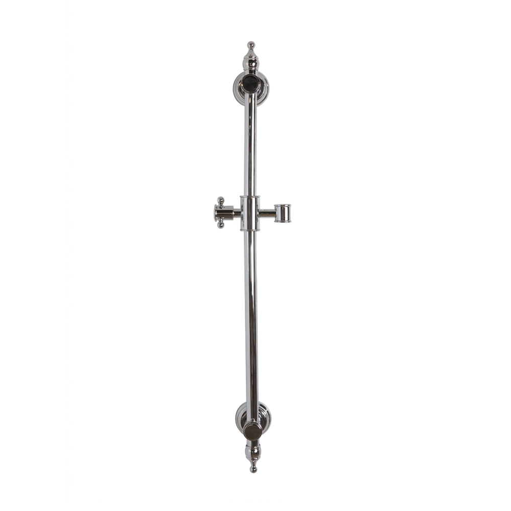 Wall-mount round rail with hook for hand-held shower head. Shipping class 1.