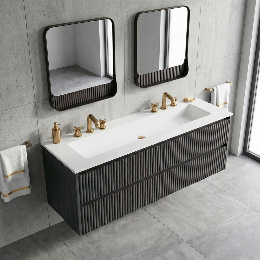 Wall-mount under-counter vanity with four drawers and a plumbing notch in the back, handmade in our factory in Chicago by master artisans using the finest quality American woods from 100% natural, renewable forests. Designed for use with the K60, K60B, or K60C vanity top sinks (all sold separately). This vanity is stocked and participates in the QUICK-SHIP program – ships within 48 hours of the order. Shipping Class 4. Finishes available for Quick-Ship: 01 White Maple, 07 Natural Walnut, 20 Ash Gray, 08 Matte White.