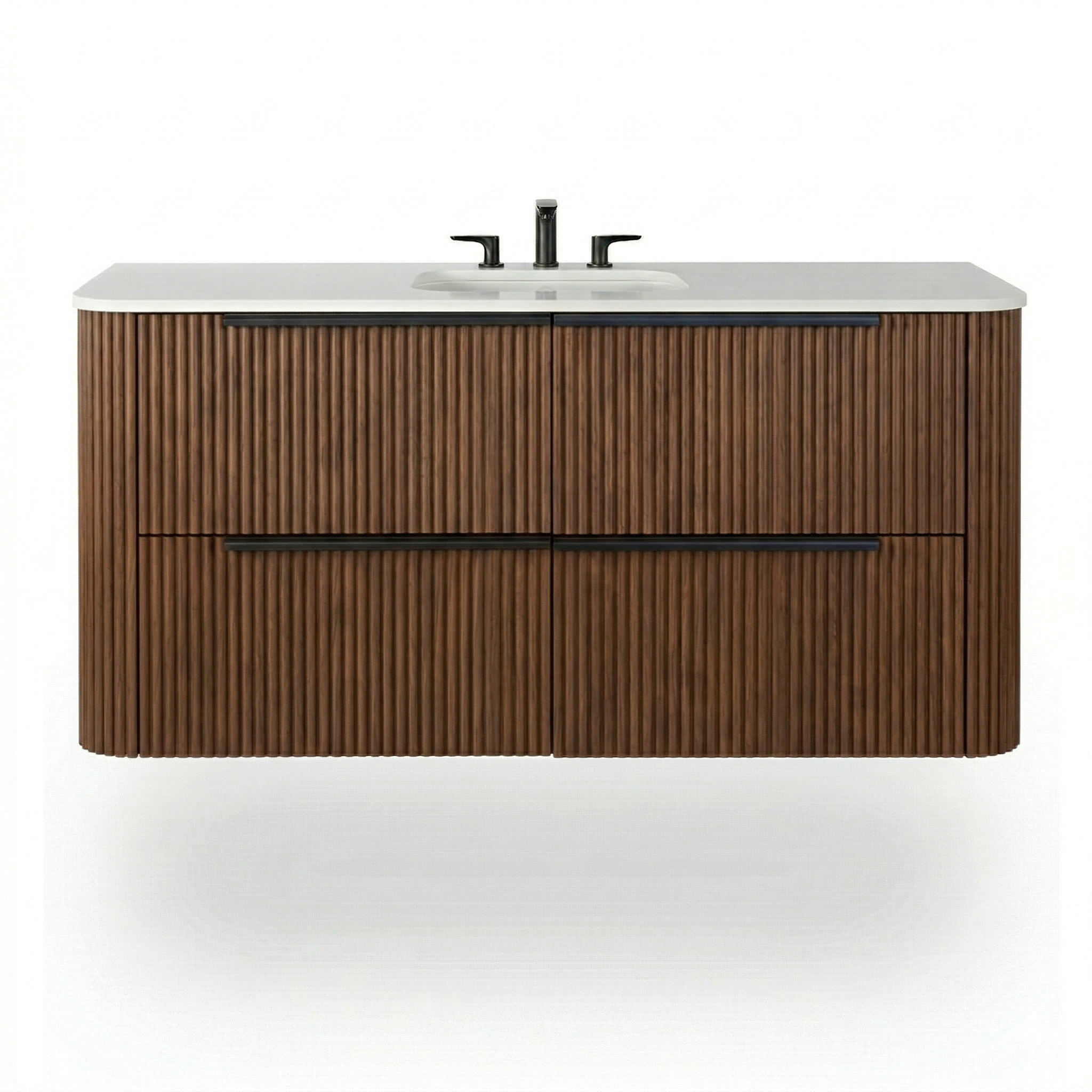 Wall-mount under-counter vanity with rounded corners and four drawers, handmade in our factory in USA by master artisans using the finest quality American woods from 100% natural, renewable forests. Designed for use with the GDS-48ST countertop and sinks 5448, 5446UN, CT58UN, K48-FLT or K48B-FLT (all sold separately). Includes K131 pulls (installed). Shipping Class 4.